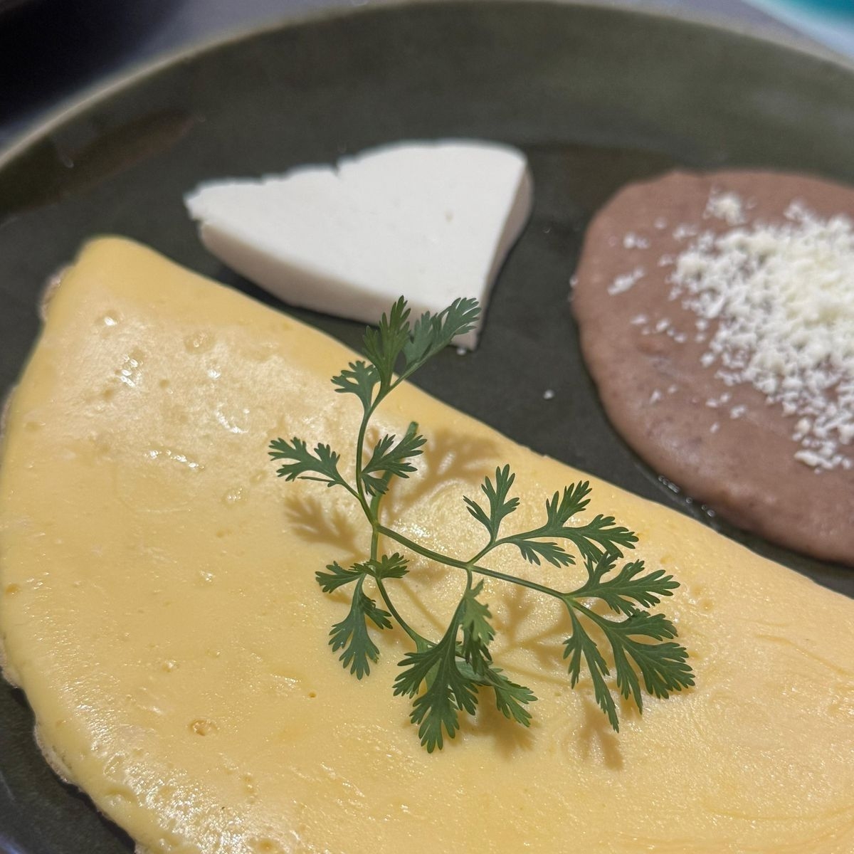 2pz de huevo, con relleno de pancita (100g) champiñón con pimientos y queso oaxaca, acompañado de frijoles y panela.