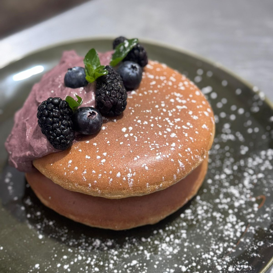 2pz de esponjositos hotcakes (300g), montados con crema de temporada, acompañados de frutos rojos.