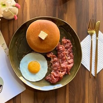 ¡El clásico! 2pz de hotcakes, acompañados de tres crujientes piezas de tocino, miel maple y un huevito estrellado.