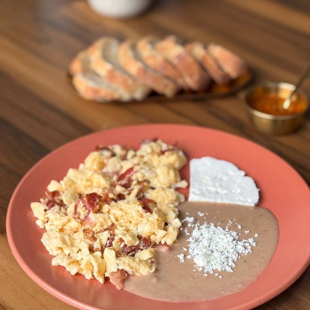100g de crujientes totopos bañados en salsa roja picosita con crema y queso cotija, acompañados de frijolitos y panela.
