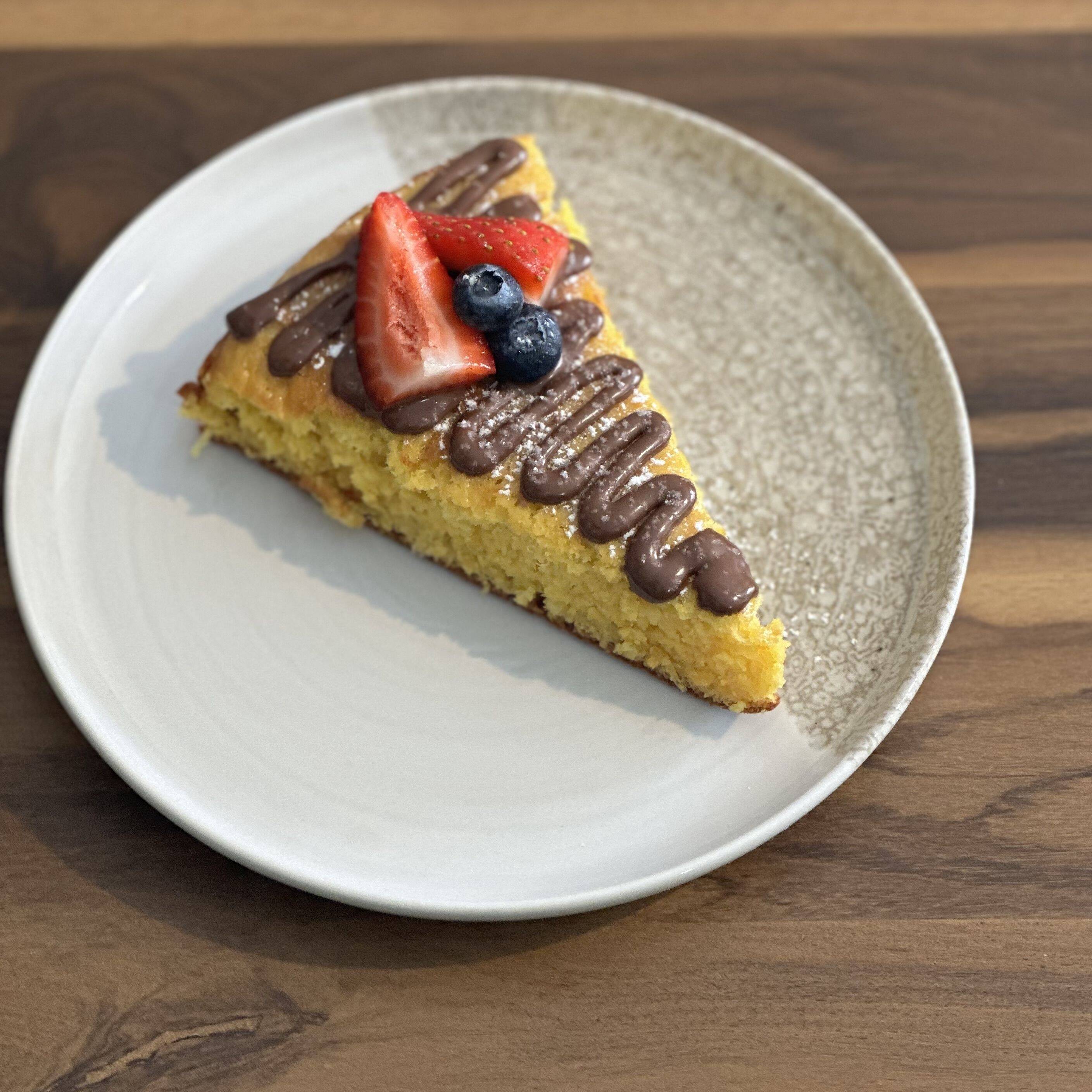 1 rebanada de pan de elote (110g aprox) cubierta con chocolate, decorada con frutos rojos y azúcar glass.