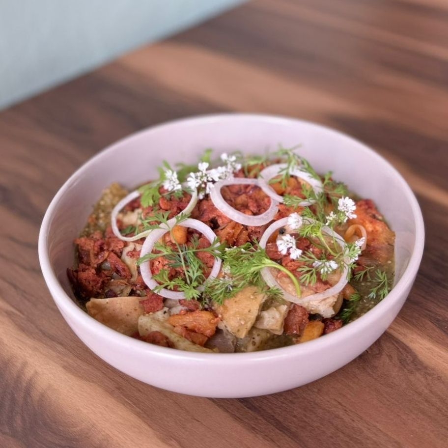 100g de crujientes totopos bañados en salsa verde coronados con 100g de carne al pastor con trozos de piña, cilantro y cebolla.