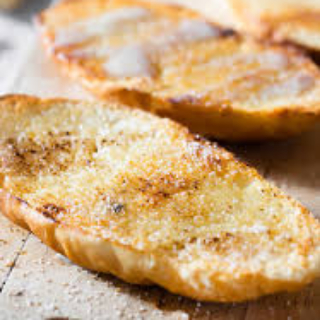 1pz de birote doradito con mantequilla cubierto de azúcar con canela, acompañados de mermelada de fresa.