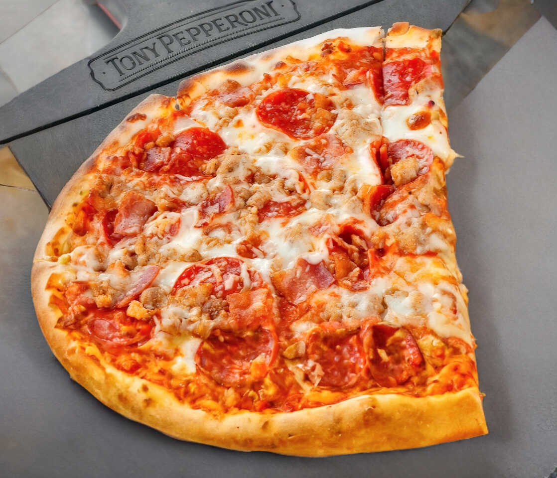 Pepperoni, tocino, carne molida, queso parmesano, queso mozzarella y salsa pomodoro.