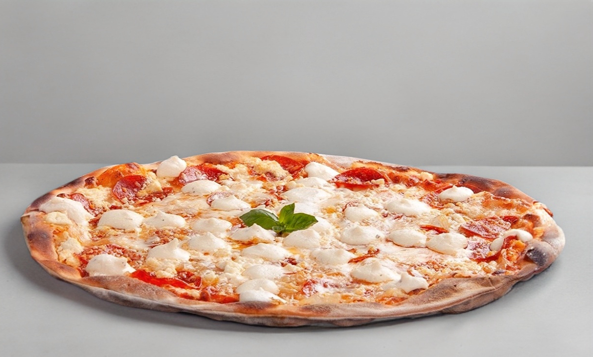 Queso de cabra, cebolla caramelizada, aderezo alfredo, pepperoni, queso parmesano, queso mozzarella y salsa pomodoro.