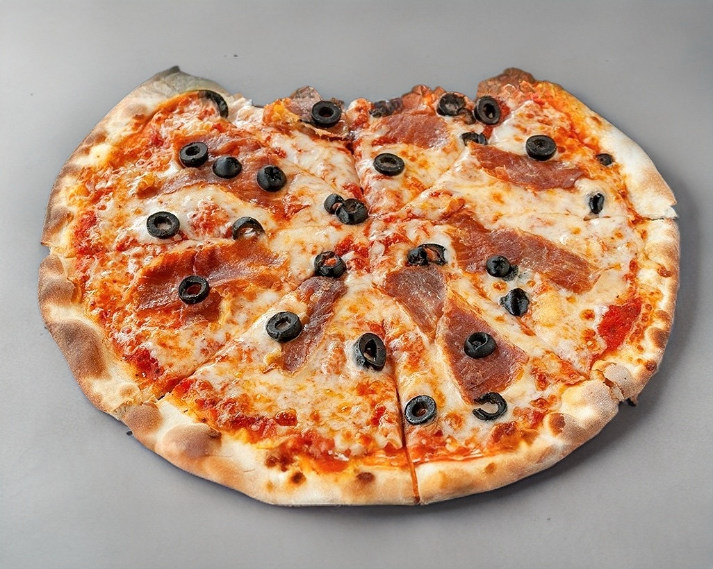 Proscuitto, aceituna negra, queso parmesano, queso mozzarella y salsa pomodoro.
