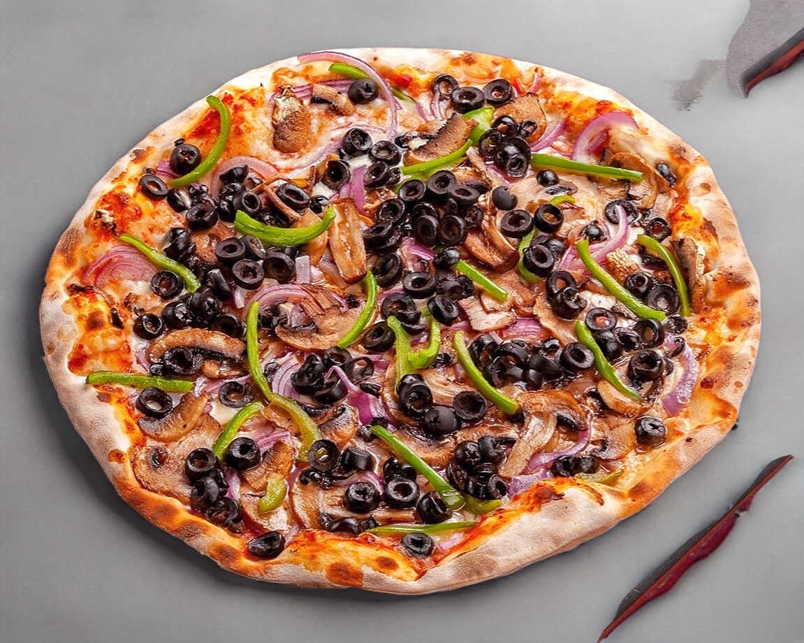Champiñones, pimiento verde, cebolla morada, aceituna negra, queso mozzarella y salsa pomodoro.