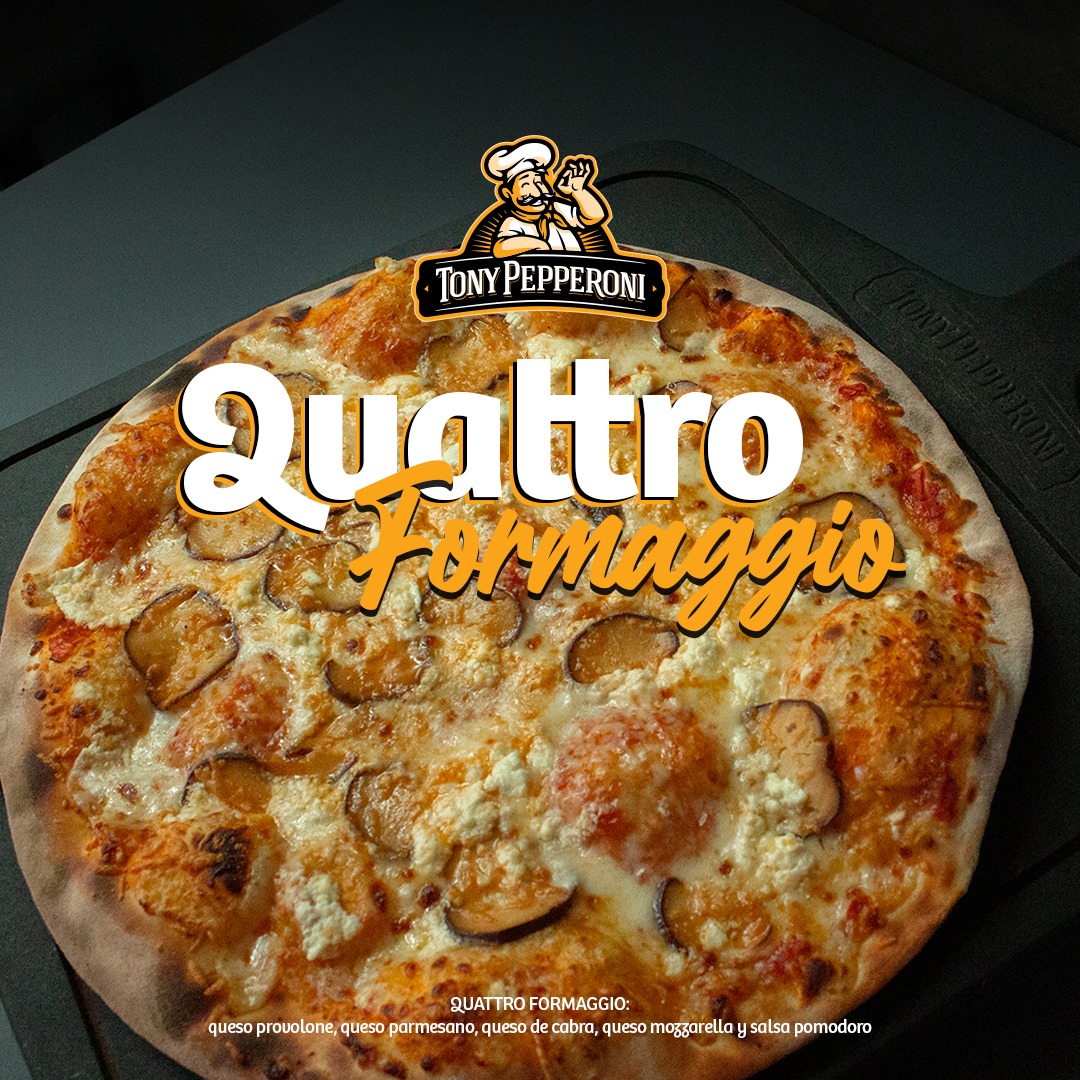 Queso provolone, queso parmesano, queso de cabra, queso mozzarella y salsa pomodoro.
