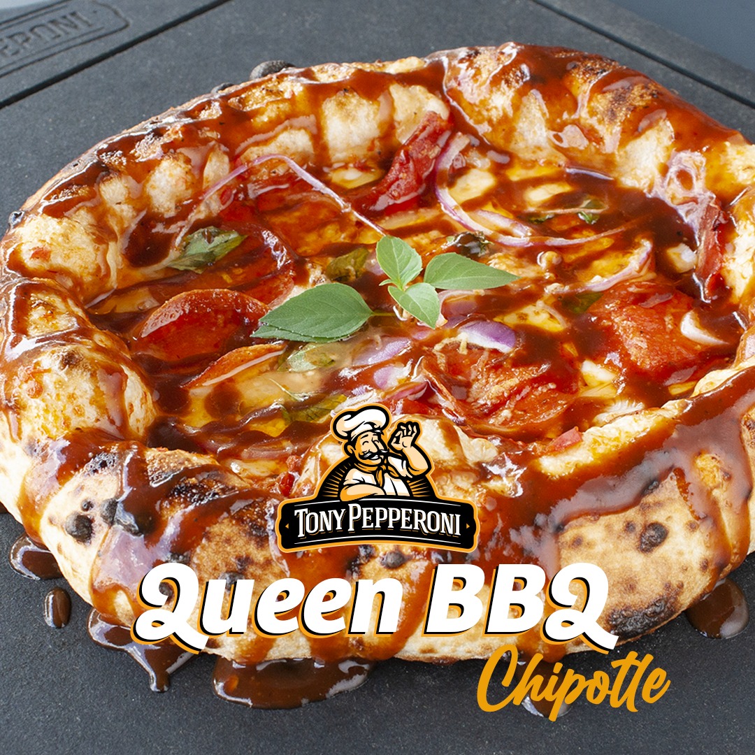 Pepperoni, albahaca, cebolla morada, aderezo BBQ, queso parmesano, queso mozzarella y salsa pomodoro.