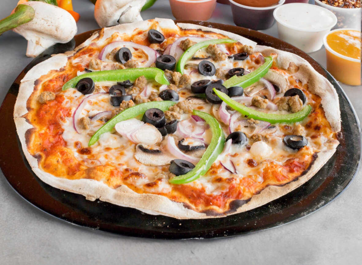 Salchicha italiana, champiñones, pimiento verde, cebolla morada, aceituna negra, queso mozzarella y salsa pomodoro.