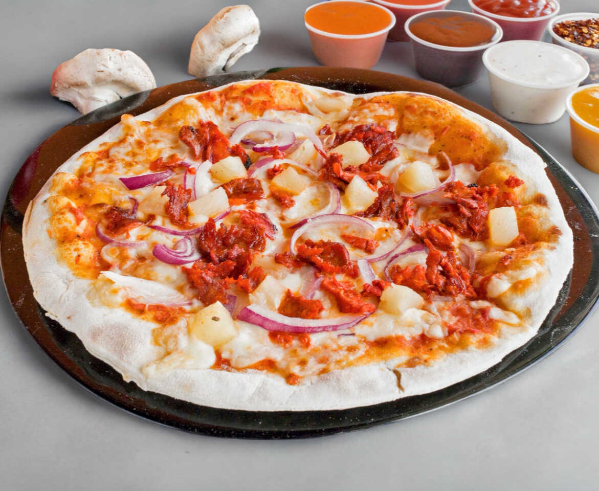 Carne al pastor de recete especial, salsa verde, piña, queso mozzarella, cebolla morada y salsa pomodoro.