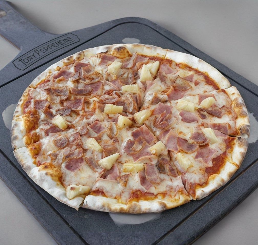 Jamón de pierna, piña, tocino, queso mozzarella y salsa pomodoro.