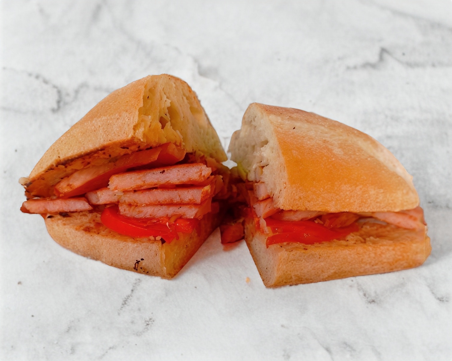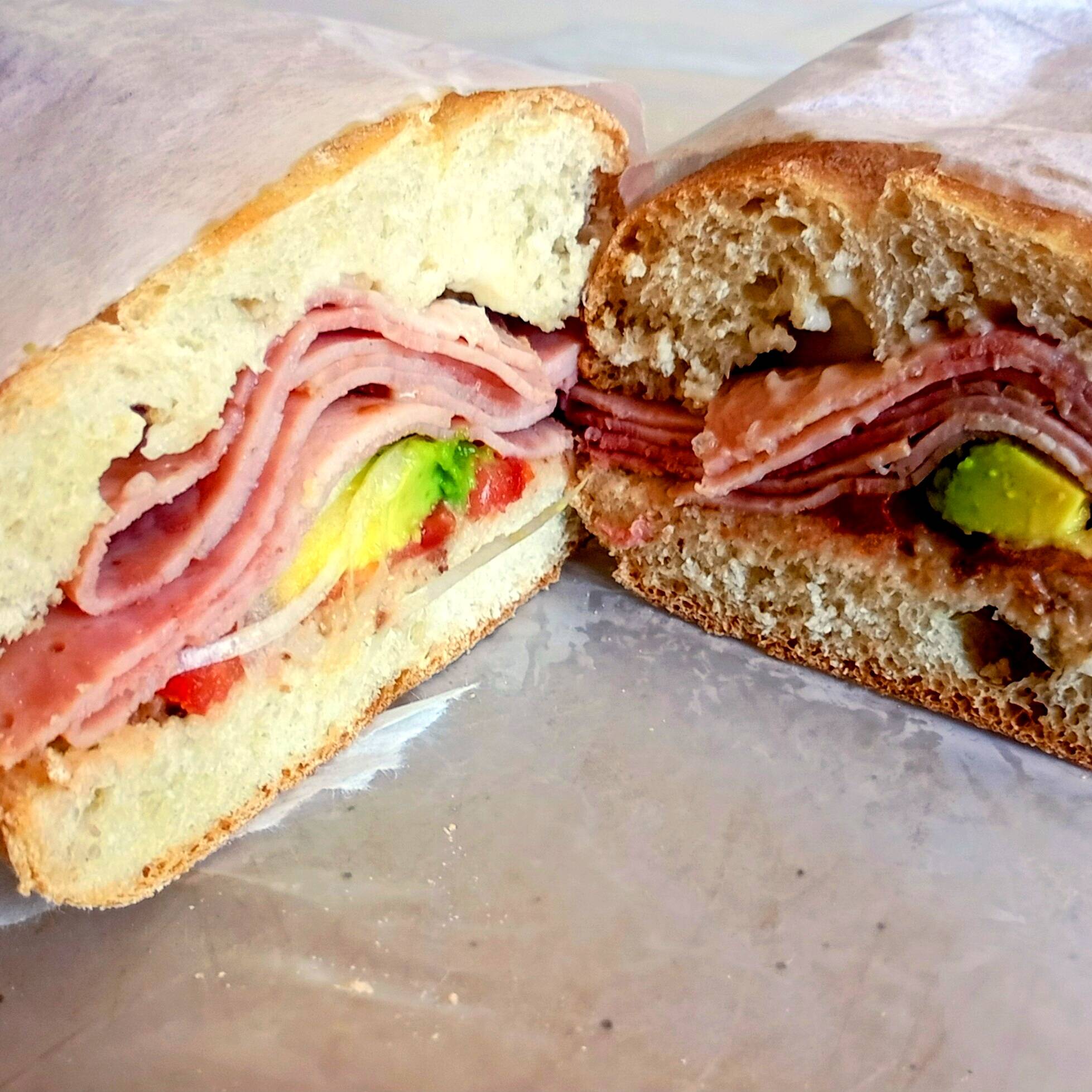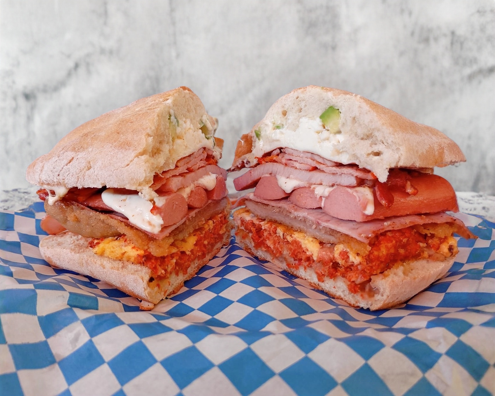 Torta combinada con pierna española, salchicha y quesillo.