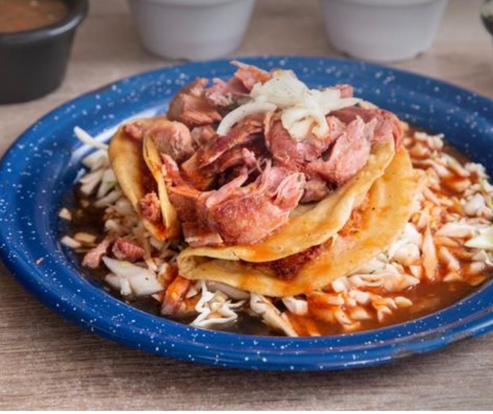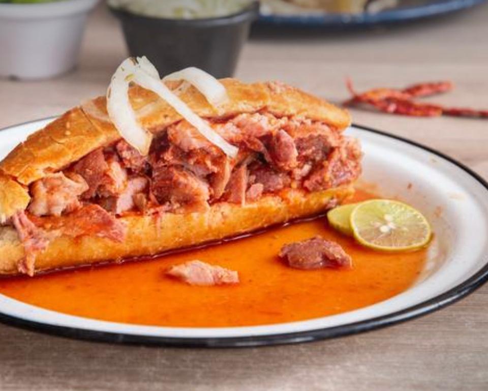 Tradicional torta ahogada carne a elegir carne, buche, costilla y lengua, acompañado con salsa, cebolla, chile y limón.