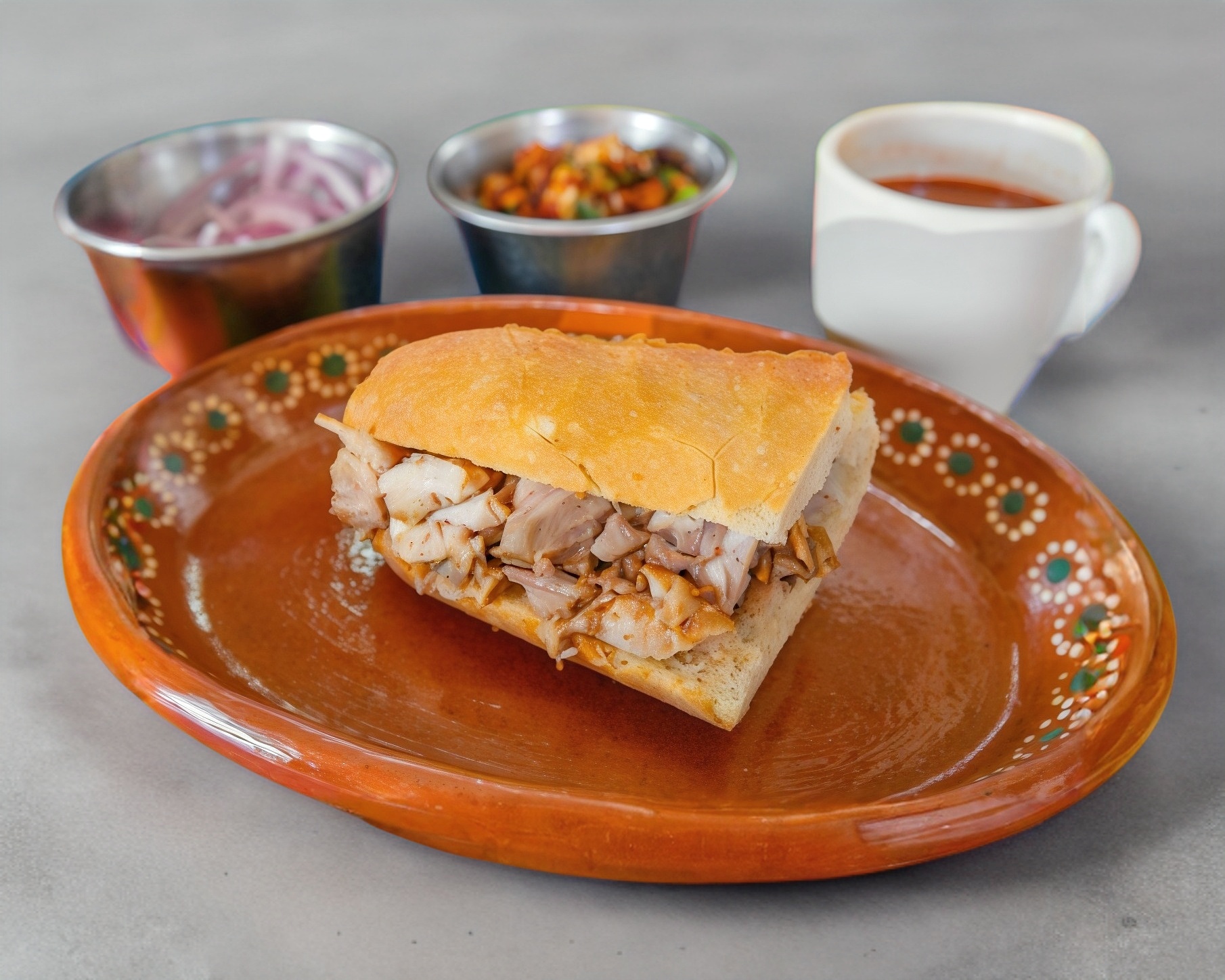Birote salado, carne asada y chamorro, bañada en consomé.
