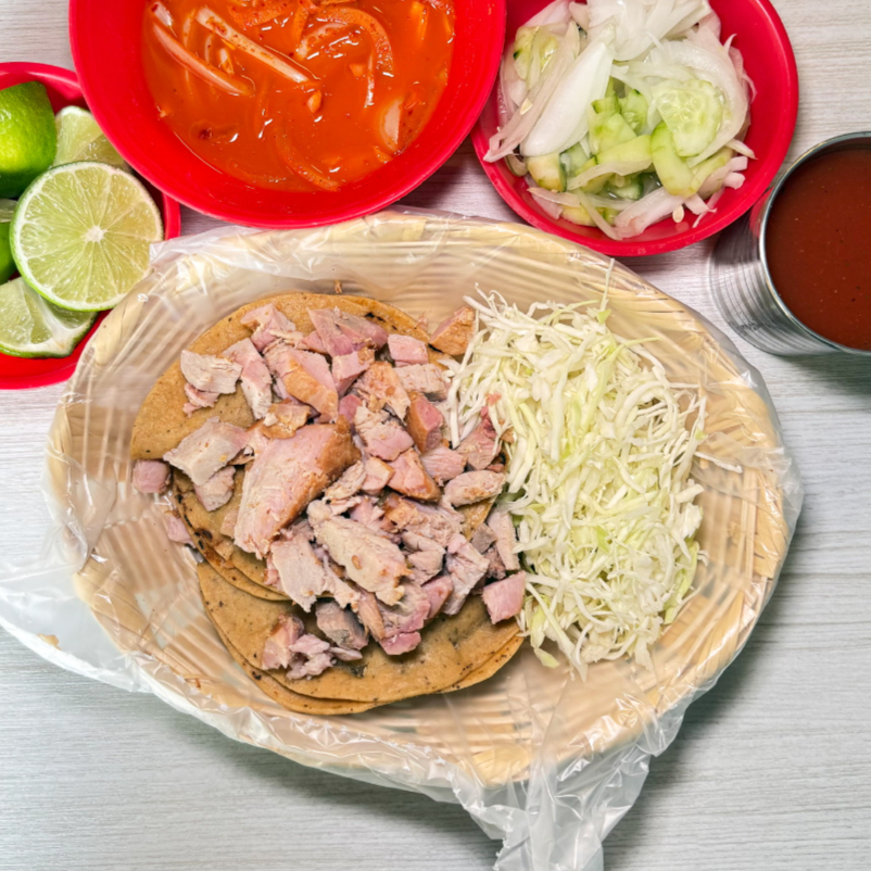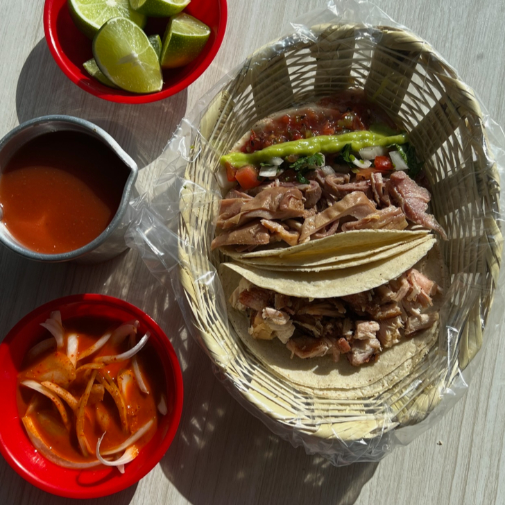 Taco blandito de carnitas acompañado de guacamole, salsa mexicana, salsa martajada y aderezo de chile verde.