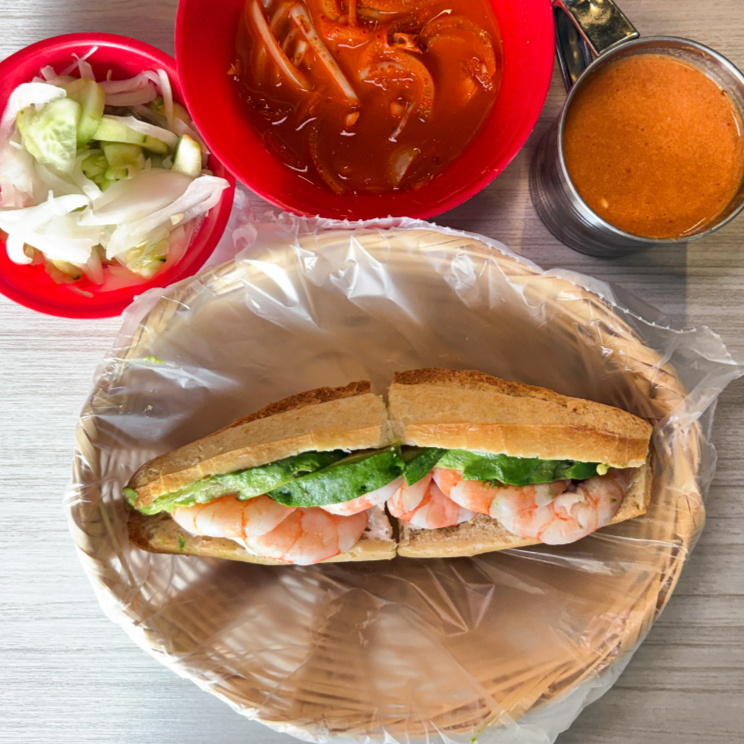 Birote crujiente relleno de camarón con aguacate, acompañado de un aderezo especial de chipotle y crema.