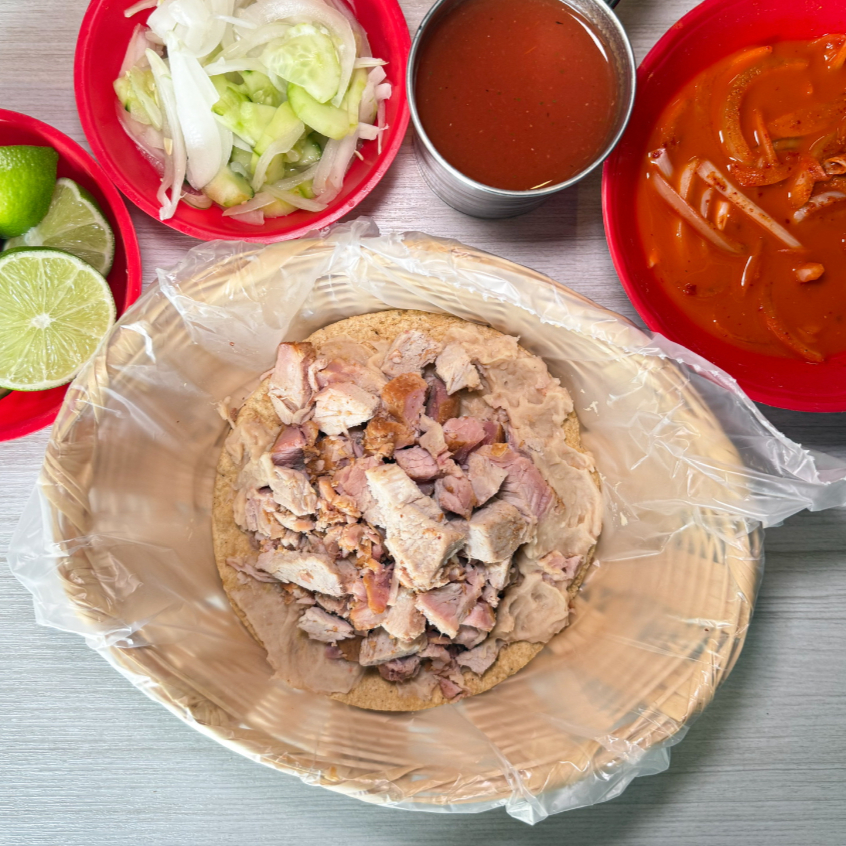Una base crujiente cubierta con carnitas, fresca col picada y un toque de la tradicional salsa de jitomate.