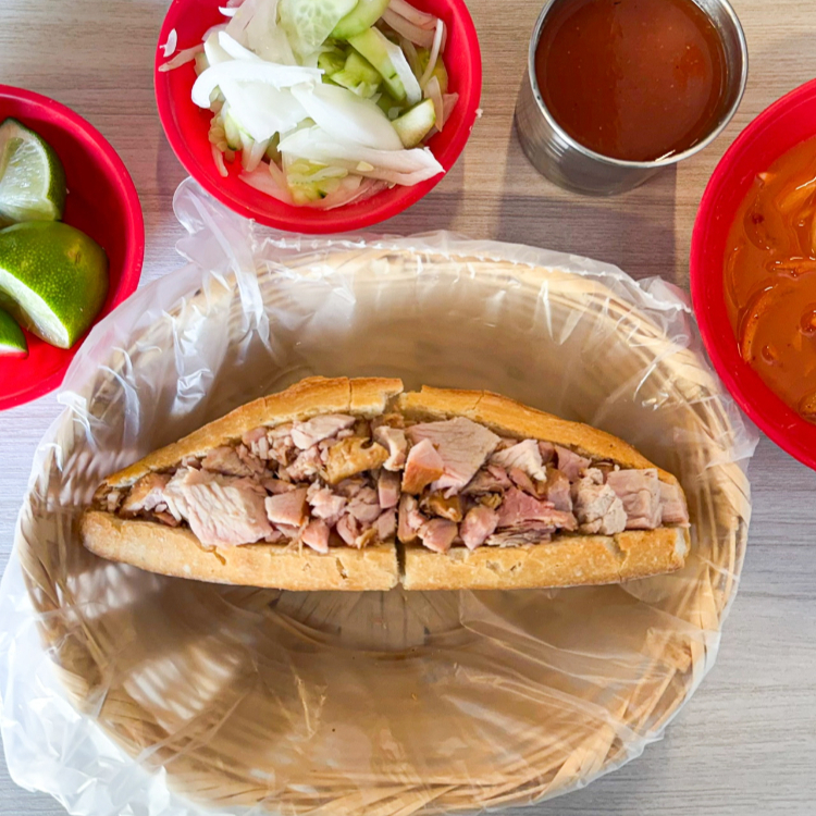 Birote crujiente relleno de carnitas, acompañado de nuestra tradicional salsa de jitomate y picante con cebolla. Un clásico jalisciense.