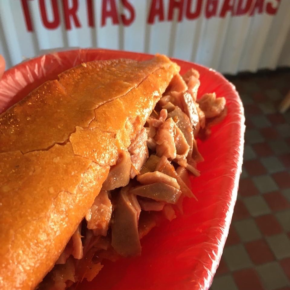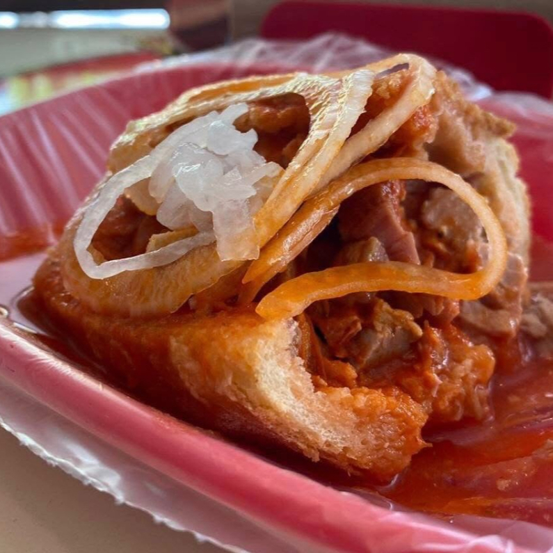 Bolillo con carnitas a su elección bañada de nuestra deliciosa salsa y acompañada de picante, cebolla y limón.