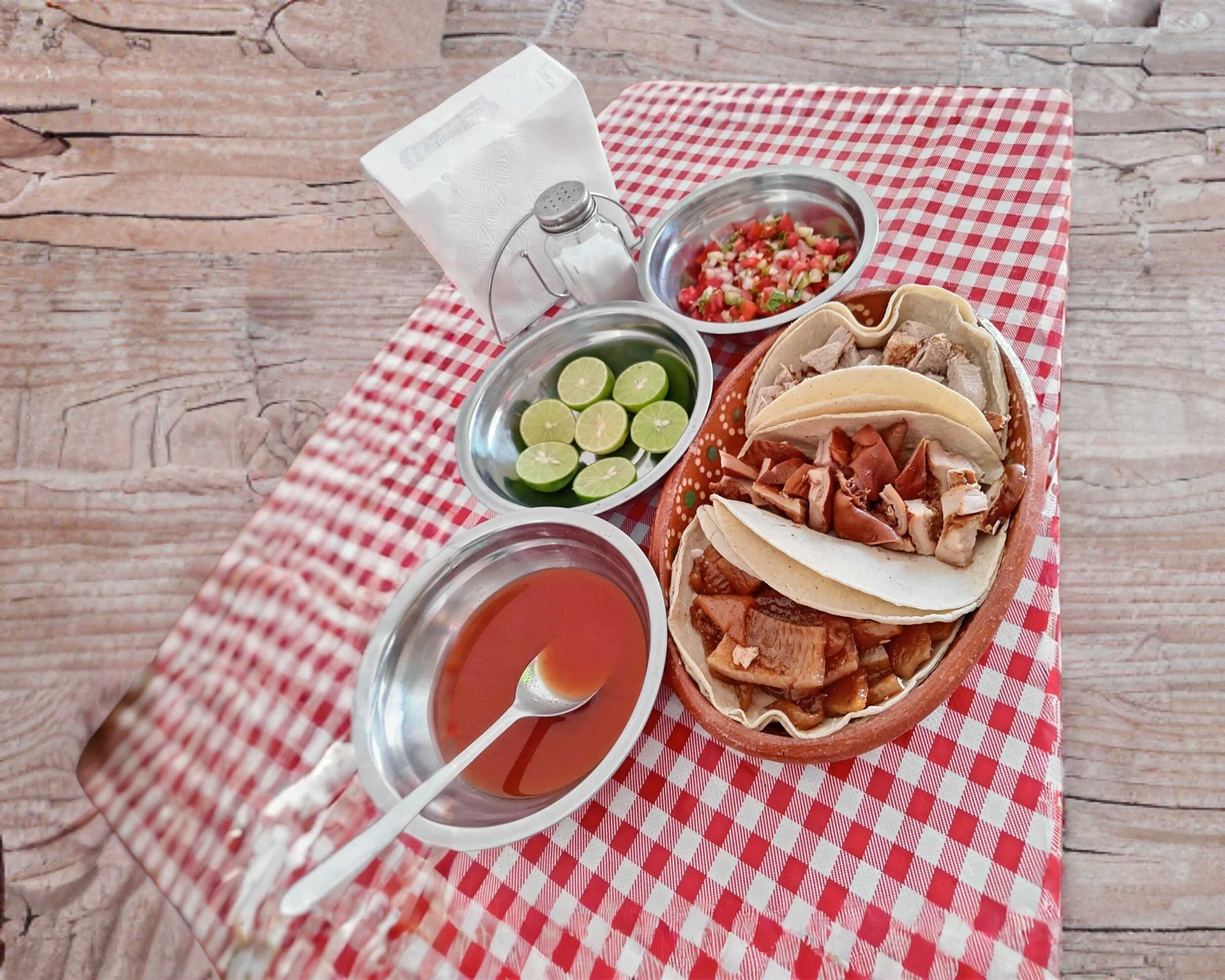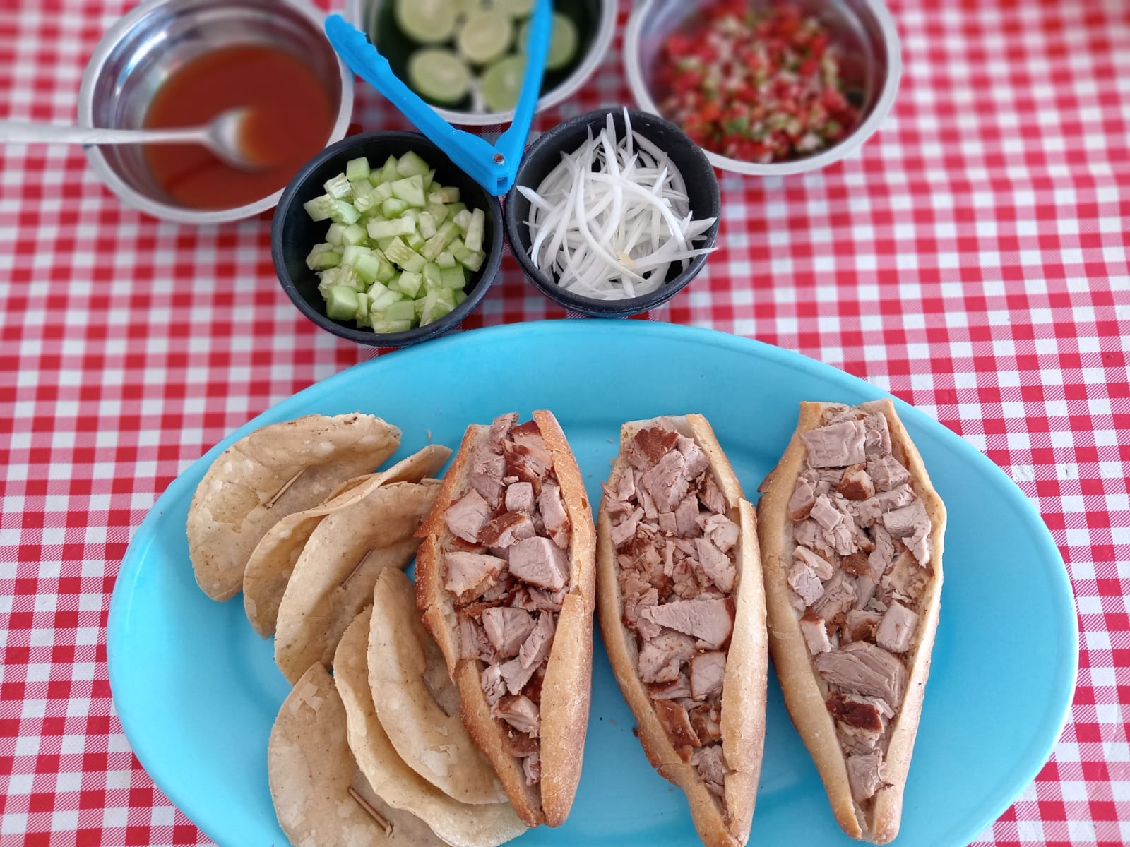 Contiene 3 tortas de carnitas, 3 tacos de papa y 3 tacos de frijol.