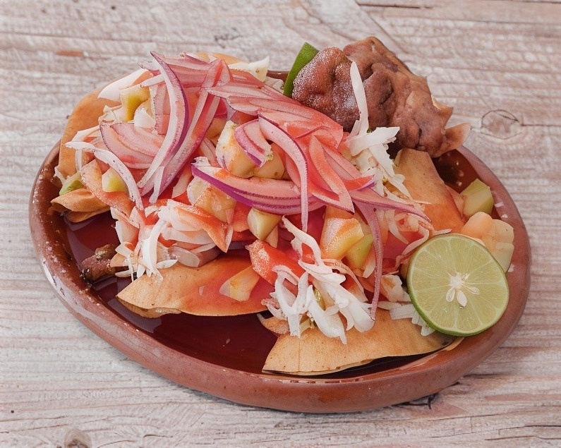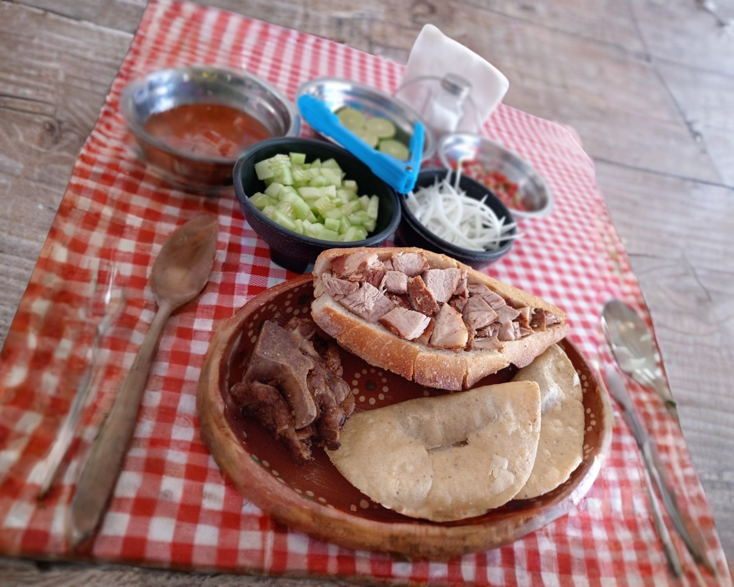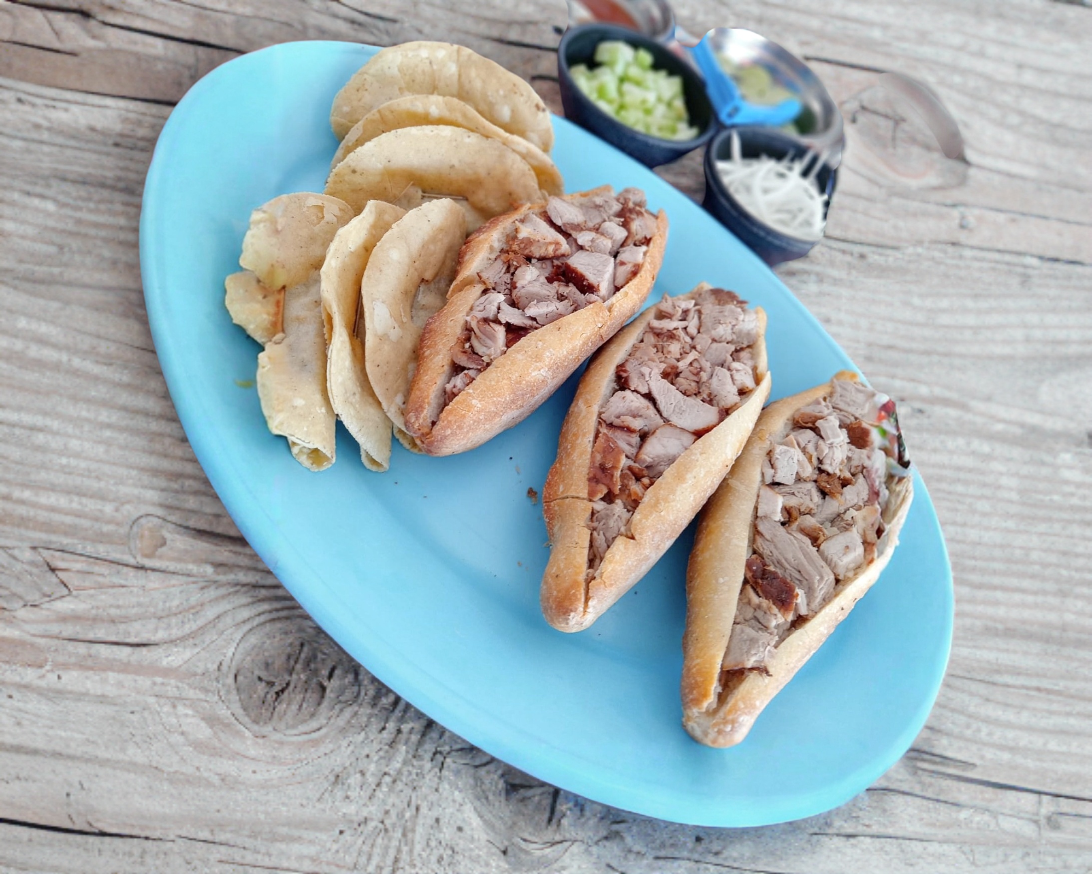 Contiene 1 torta de carnitas, 1 torta de buche, 2 tacos de frijol y 2 tacos de papa.