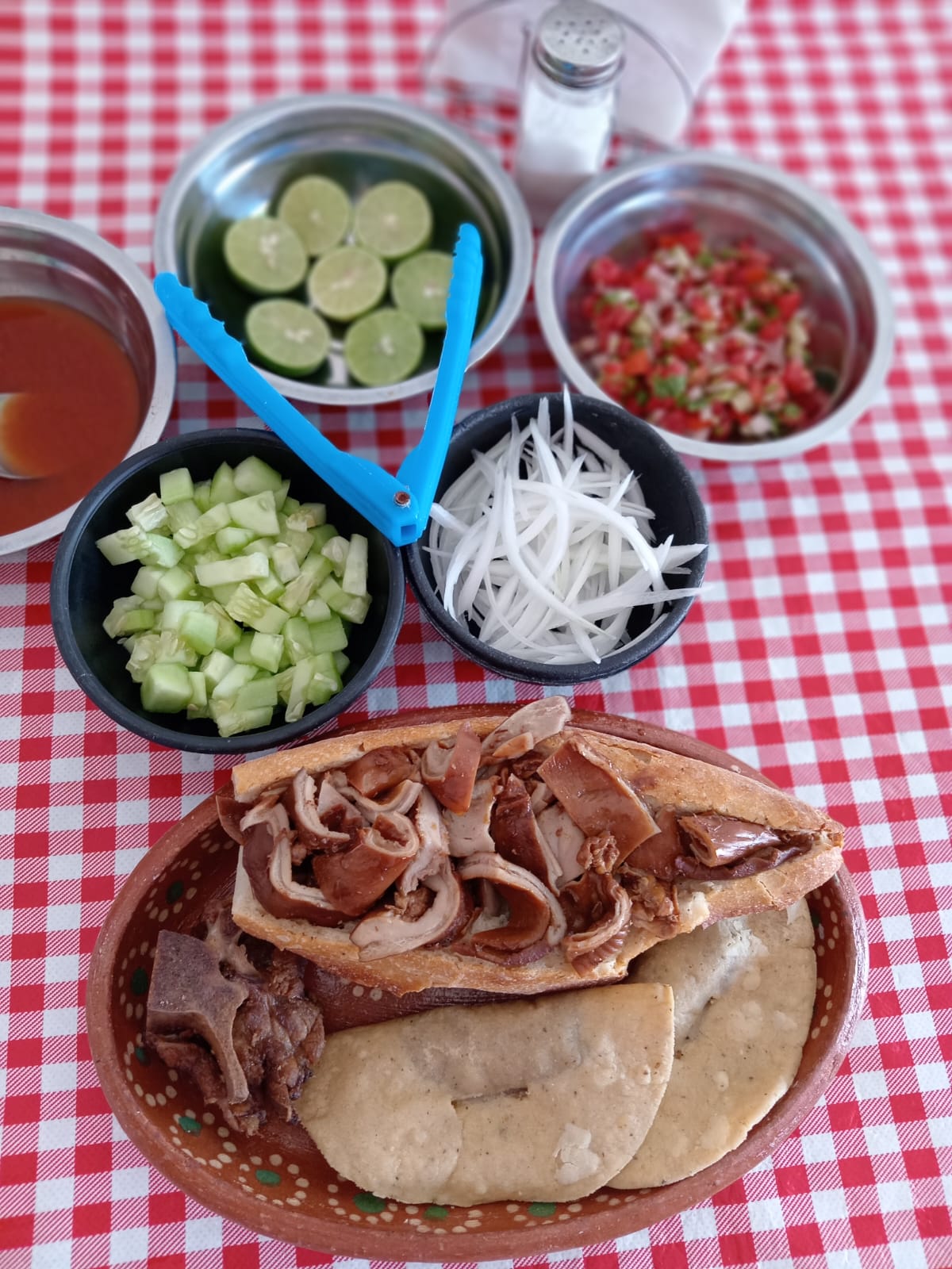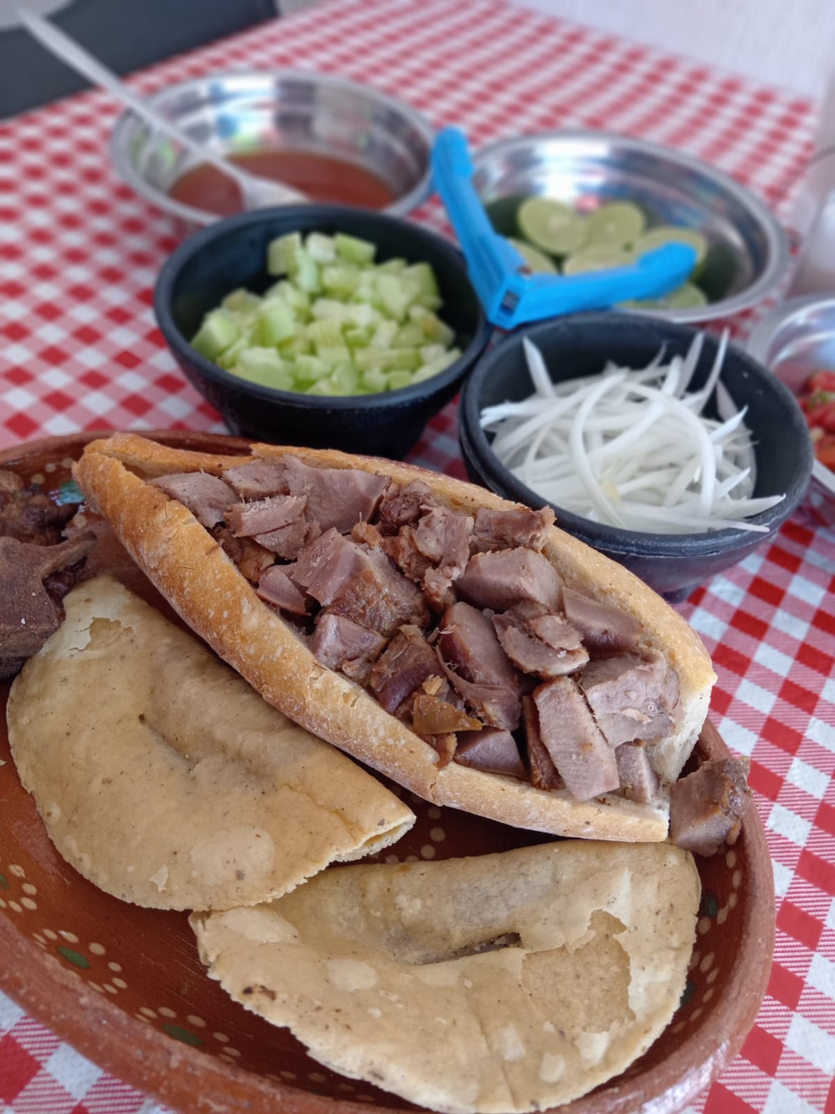 Contiene 1 torta de carnitas y 2 tacos de frijol.