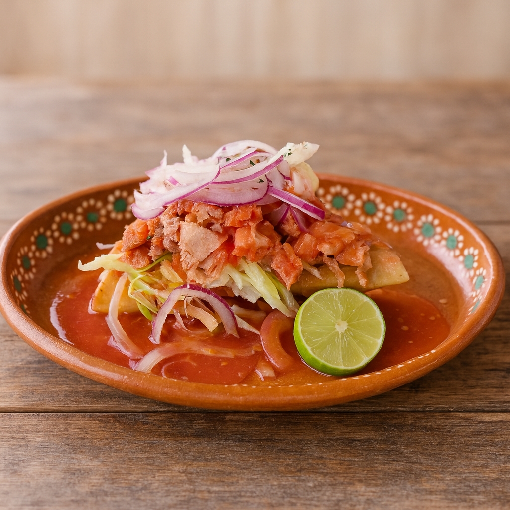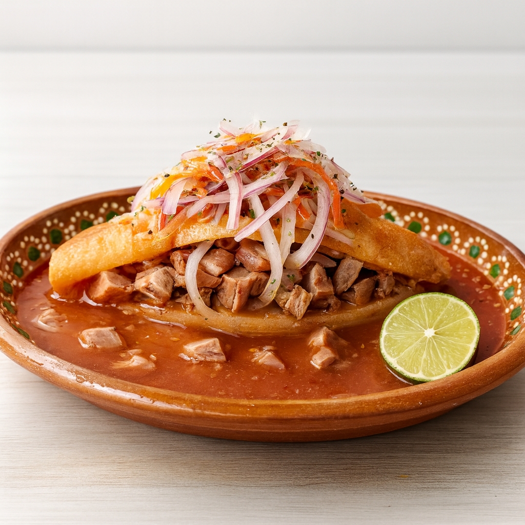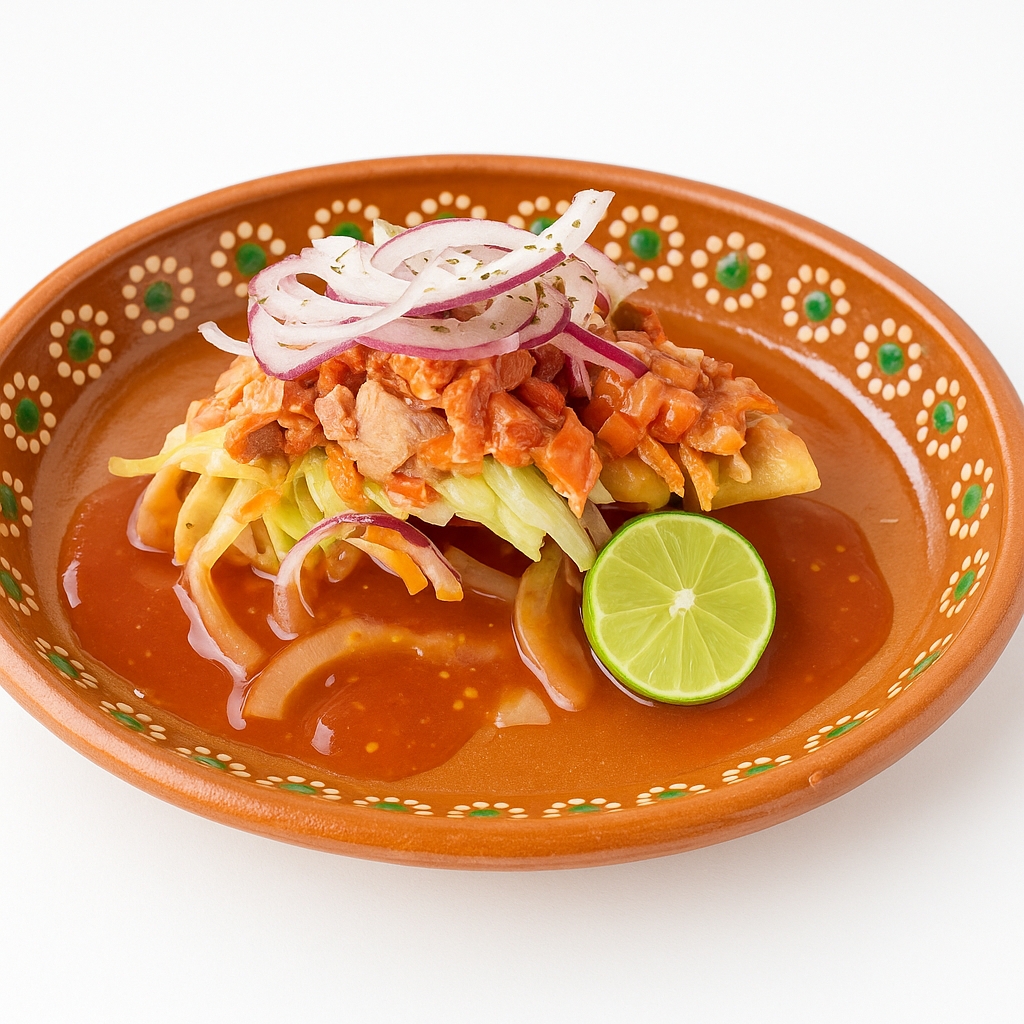 Birote salado relleno de carnitas, bañado en salsa de jitomate con orégano y un toque de chile Yahualica, coronado con cebollita con orégano. Tradición tapatía en cada bocado.