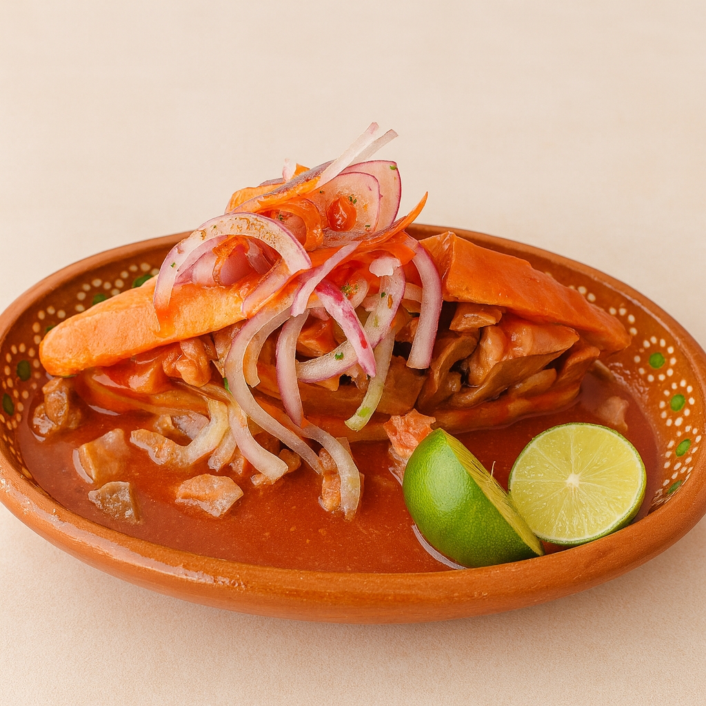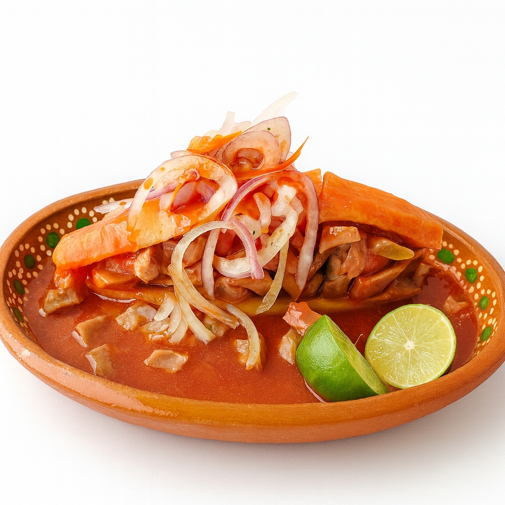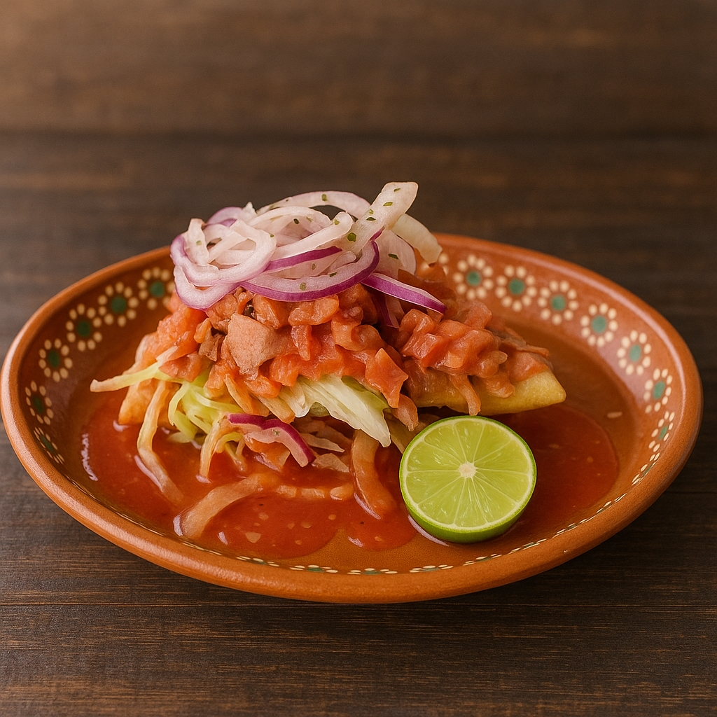 Birote salado relleno de carnitas, bañado en salsa de jitomate con orégano y un toque de chile Yahualica, coronado con cebollita con orégano. Tradición tapatía en cada bocado.