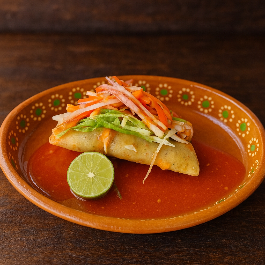 Taco dorado crujiente servido al estilo tradicional tapatío, con carne suave y jugosa colocada encima del taco