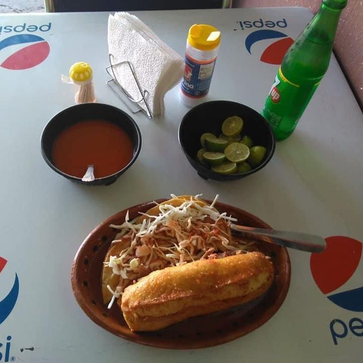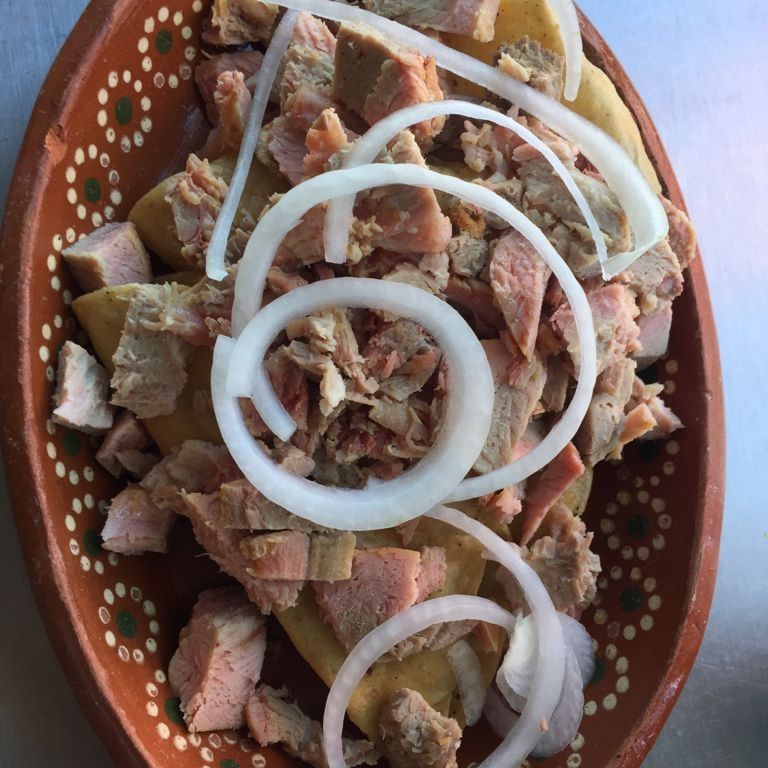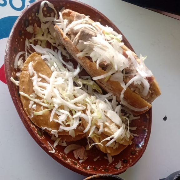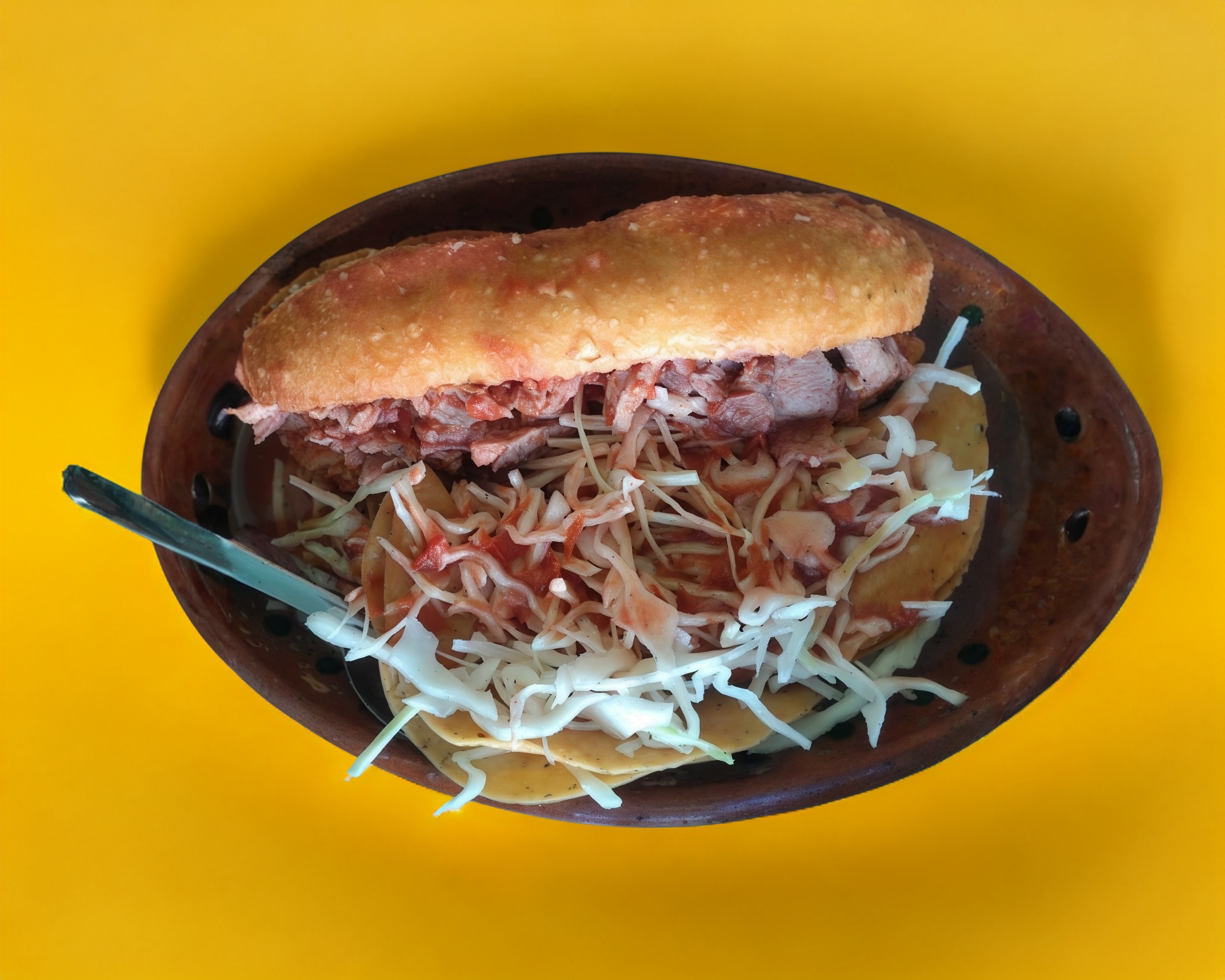 1 torta ahogada de carnitas (salsa dulce, limón, cebolla y picante)