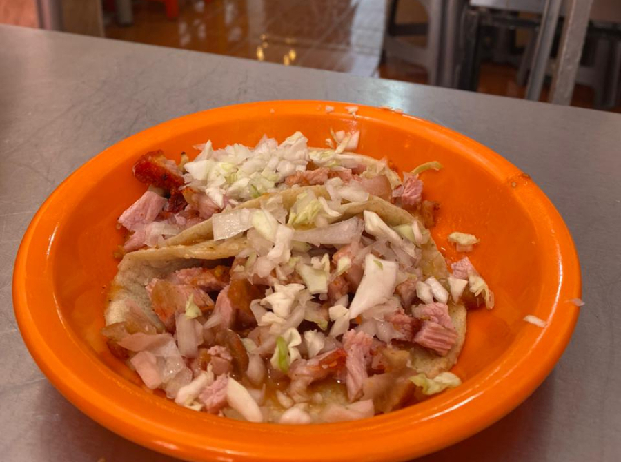 Taco con porcion de carne, acompañada de cebolla, col, chile y bañada en salsa de jitomate
