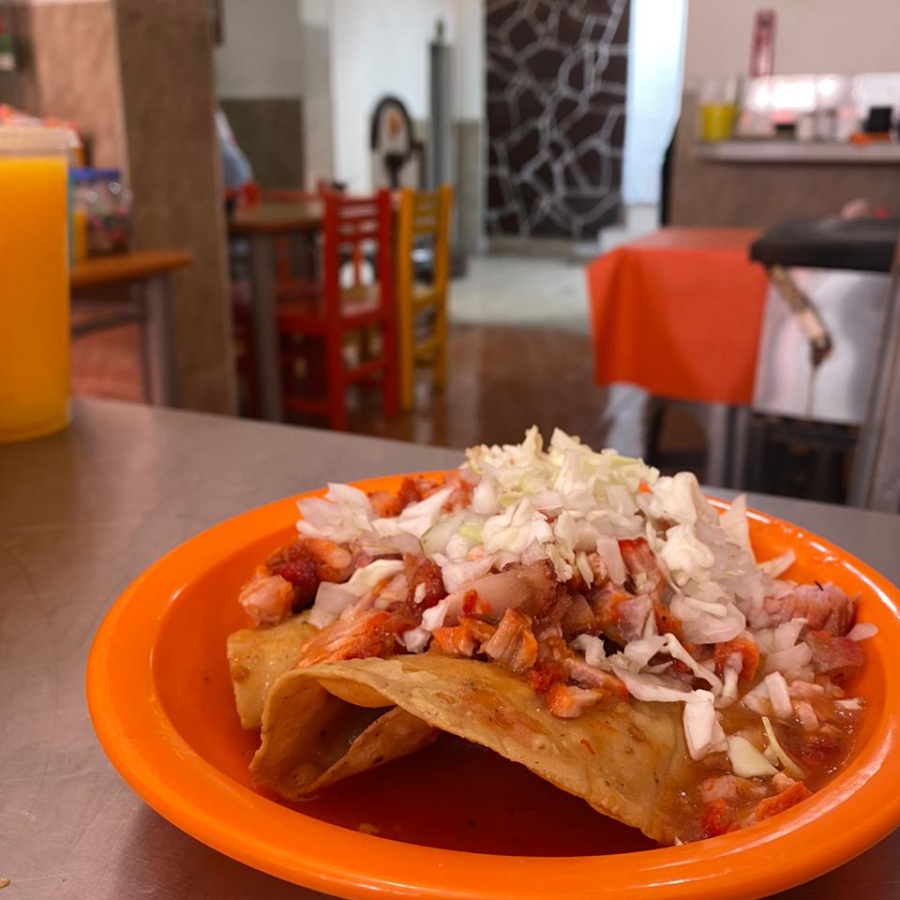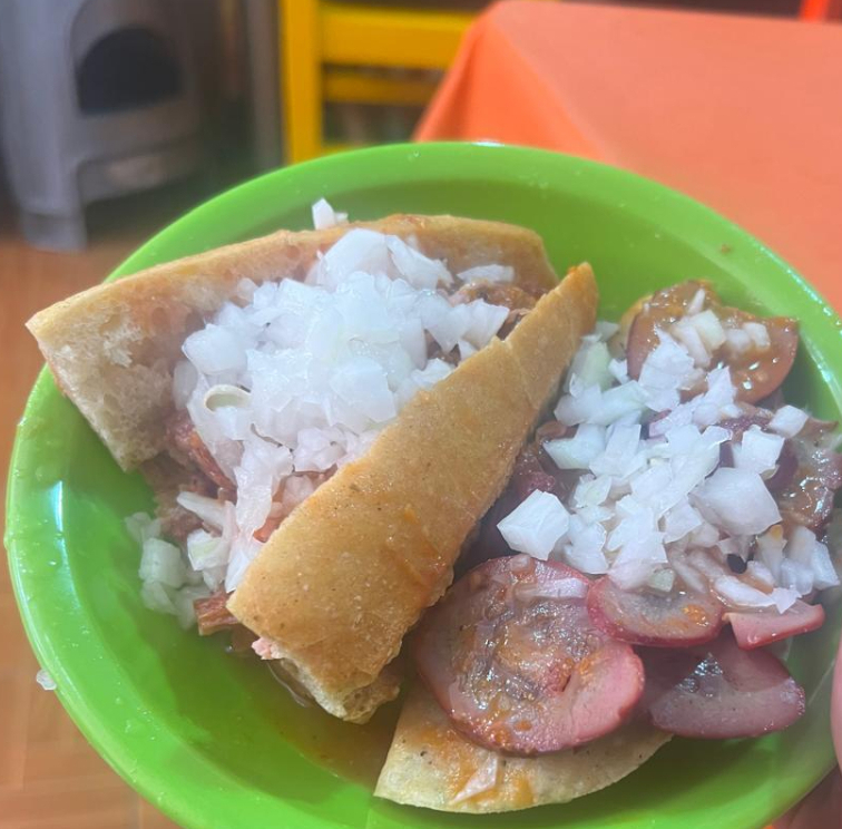 Acompañada de cebolla, col, chile y bañada en salsa de jitomate.