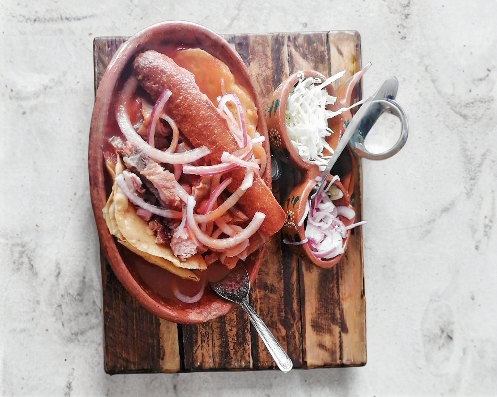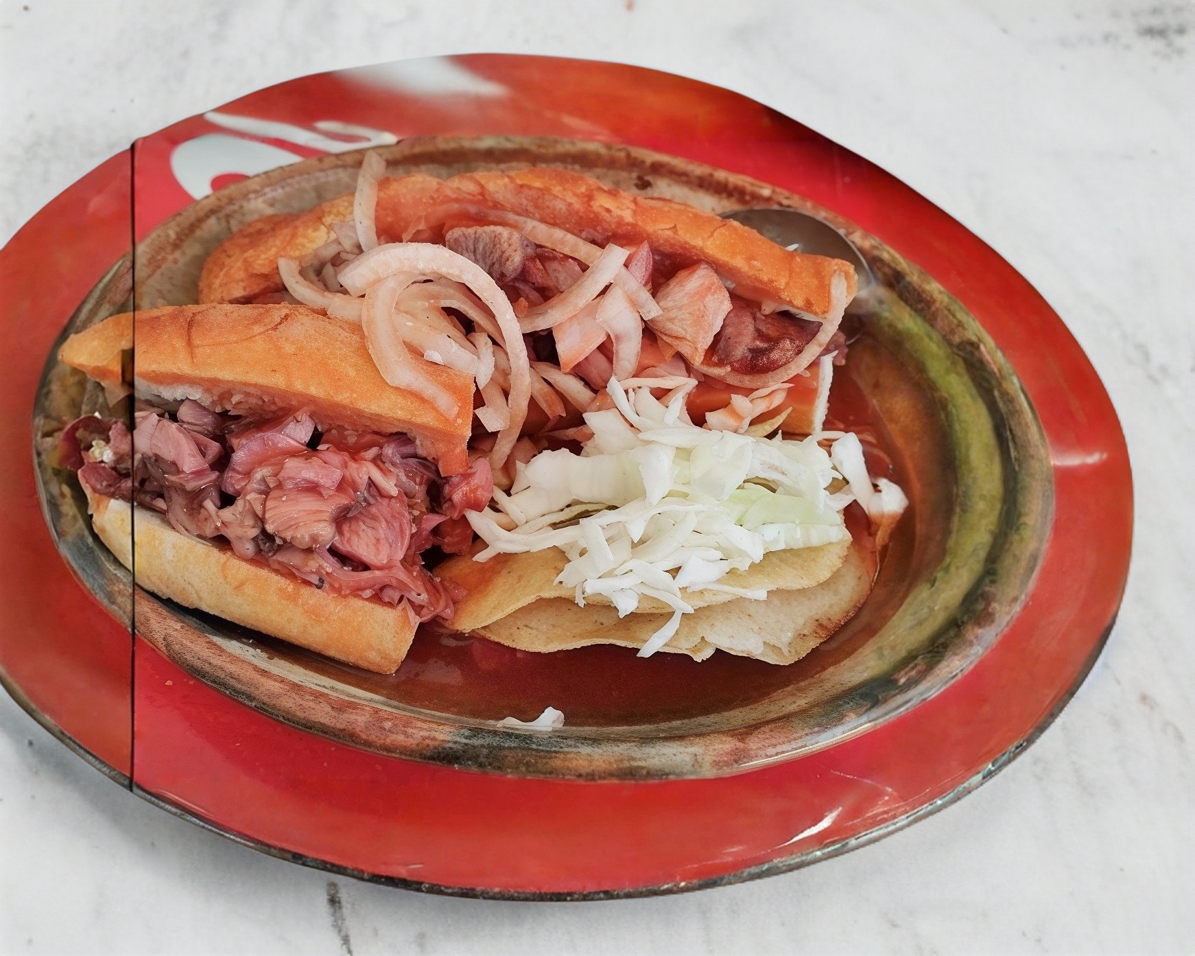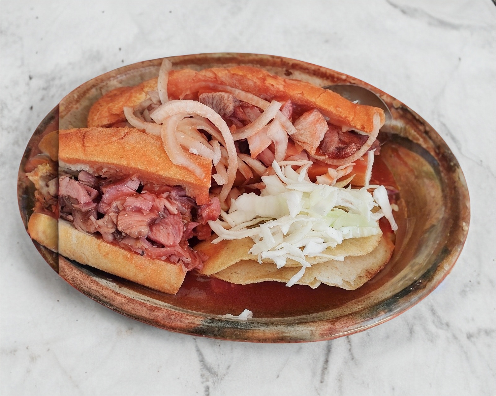 Torta Ahogada con Tacos (Porción Personal) – Disfruta una auténtica torta ahogada bañada en salsa con un toque picante y cebolla, acompañada de 2 tacos extra. Incluye col y chile al gusto.