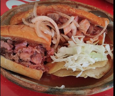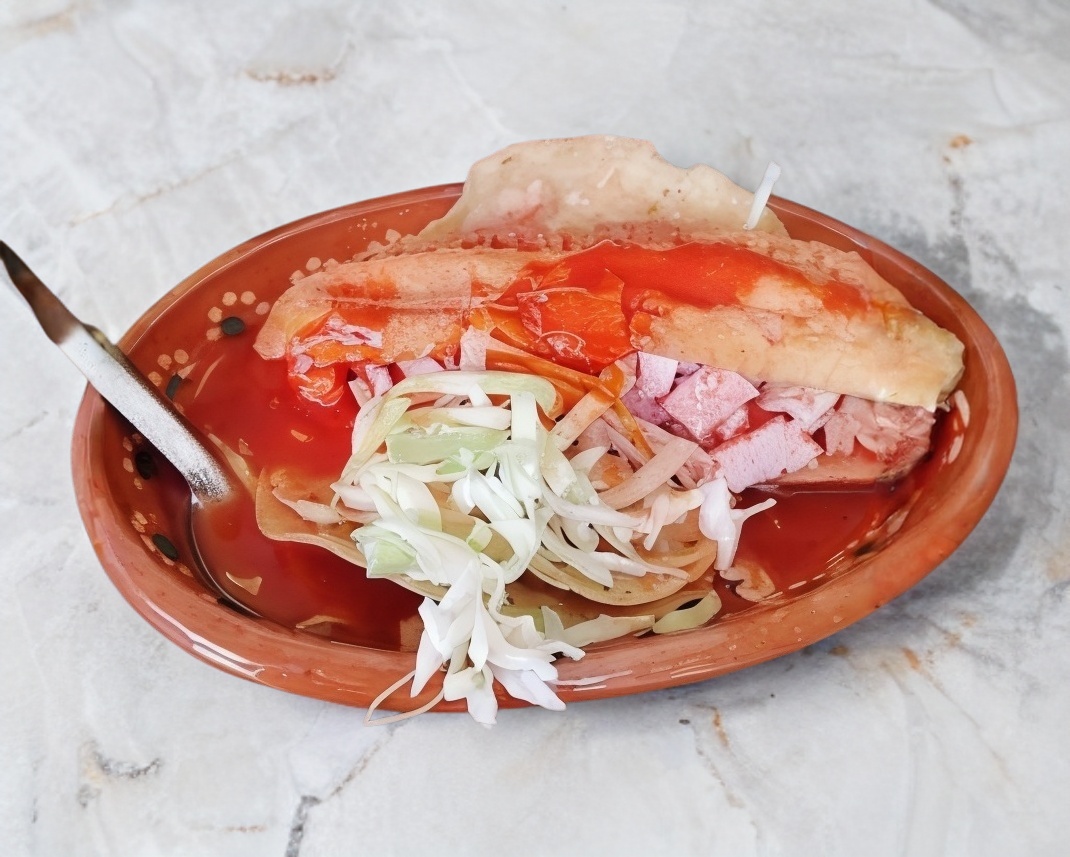 Torta Ahogada con Tacos Dorados – Pan birote salado relleno de jugosa carne bañada en salsa de torta ahogada. Incluye 2 tacos dorados crujientes para acompañar.