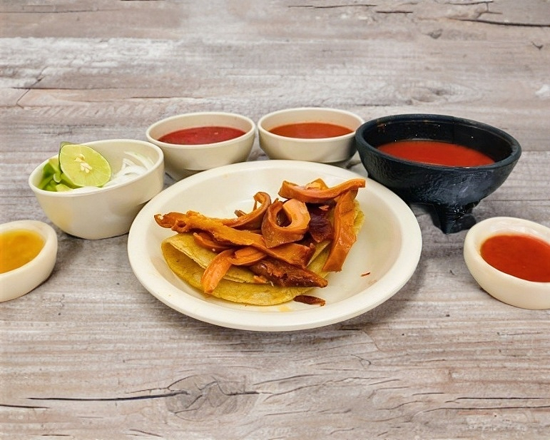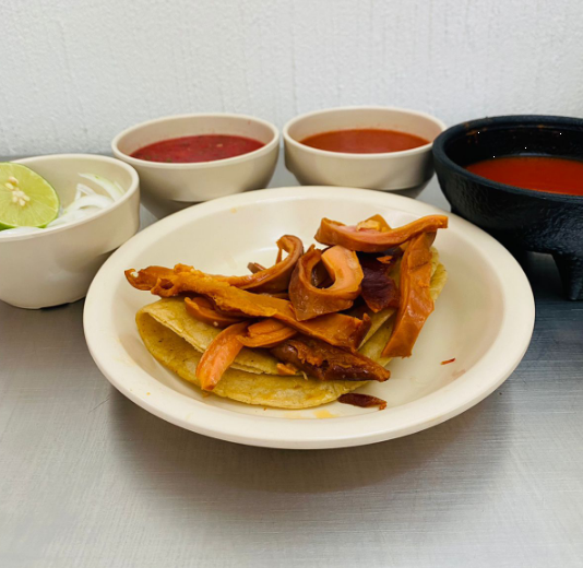 Taco dorado de tortilla de maíz relleno de papa y lengua encima