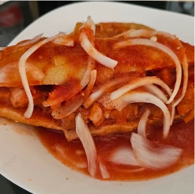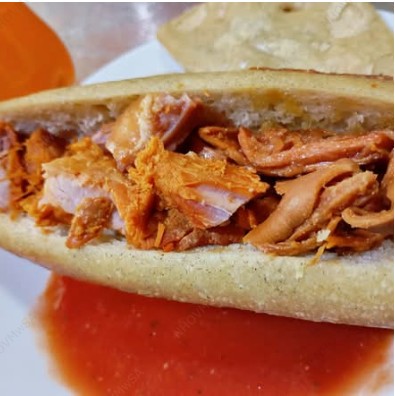 Deliciosa torta ahogada de carnitas, acompañada de salsa, salsa mexicana, picante y cebolla.