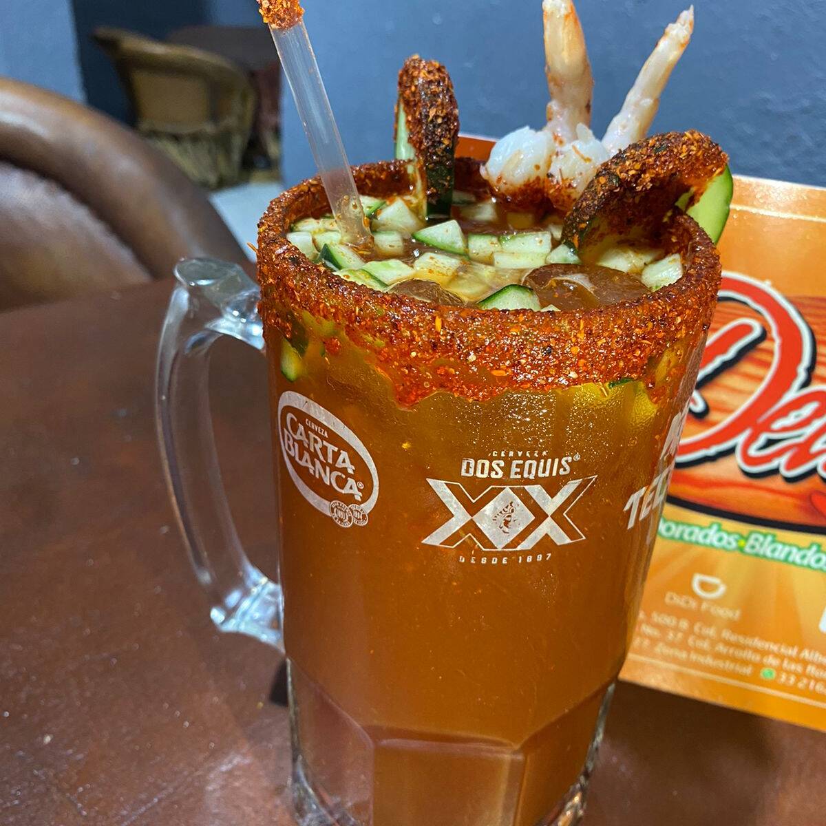 Cerveza con un Preparado de clamato con sal, limón, salsas negras y el toque de la casa.