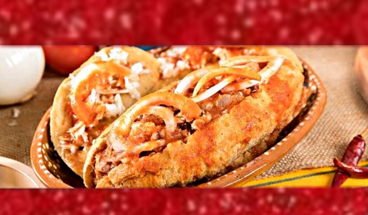 Taco con tortilla de masa relleno de frijol, papa, requezon y picadillo