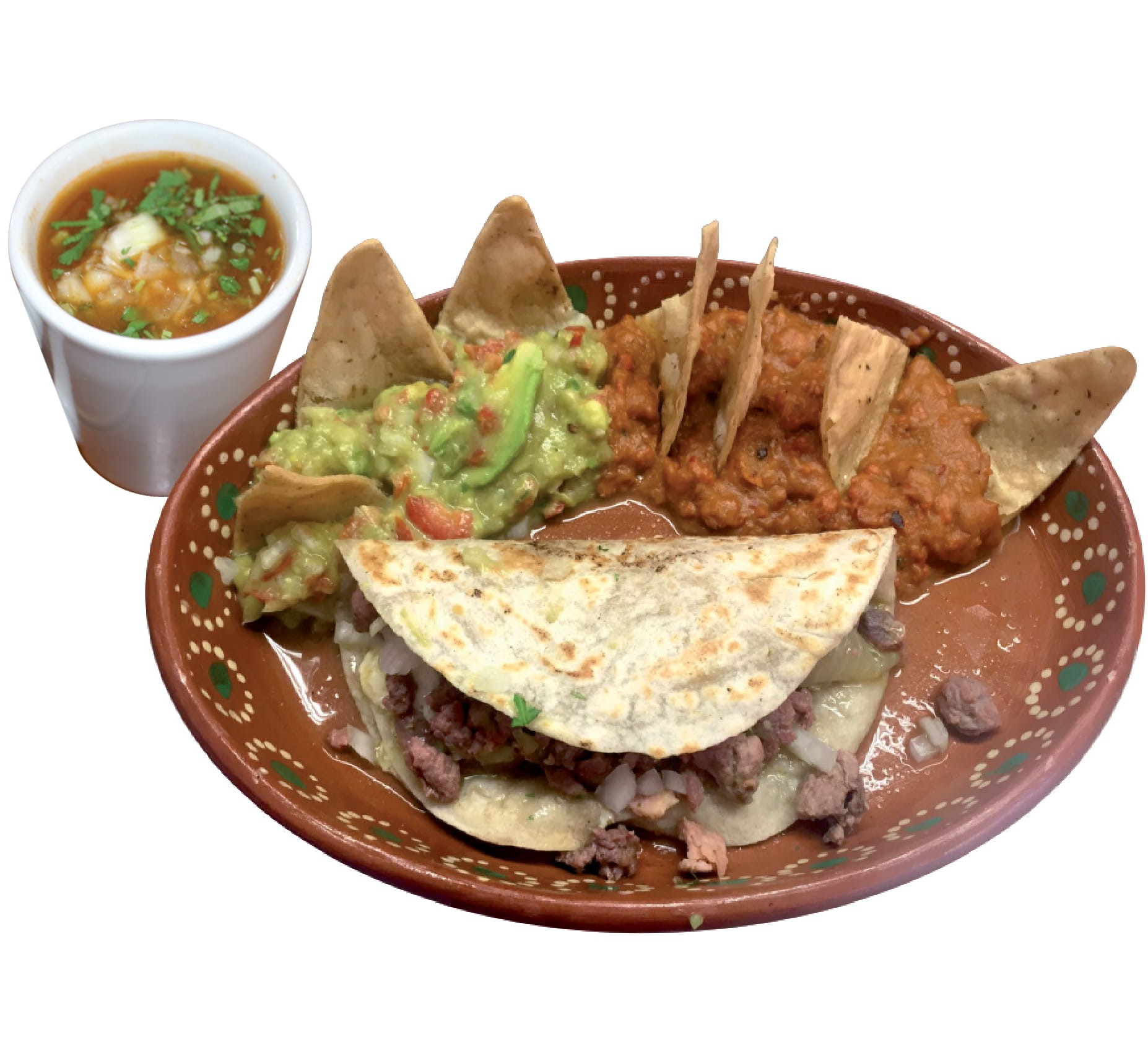 Quesadilla de tortilla de harina con carne, acompañada de frijoles y guacamole
