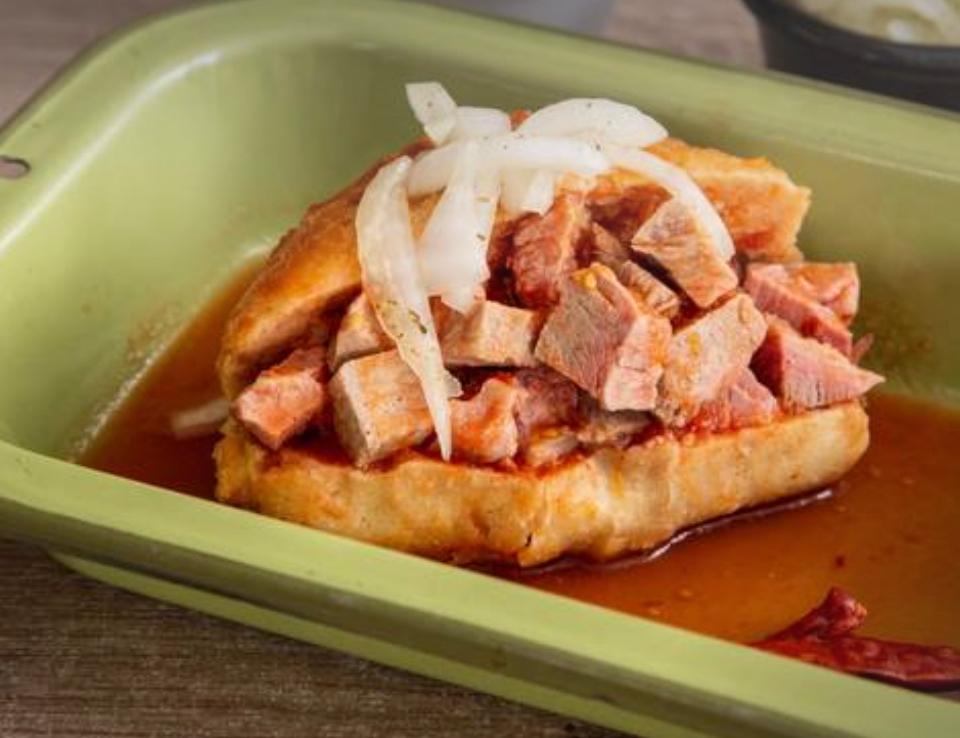 Tradicional torta ahogada carne a elegir carne, buche, costilla y lengua, acompañado con salsa, cebolla, chile y limón.