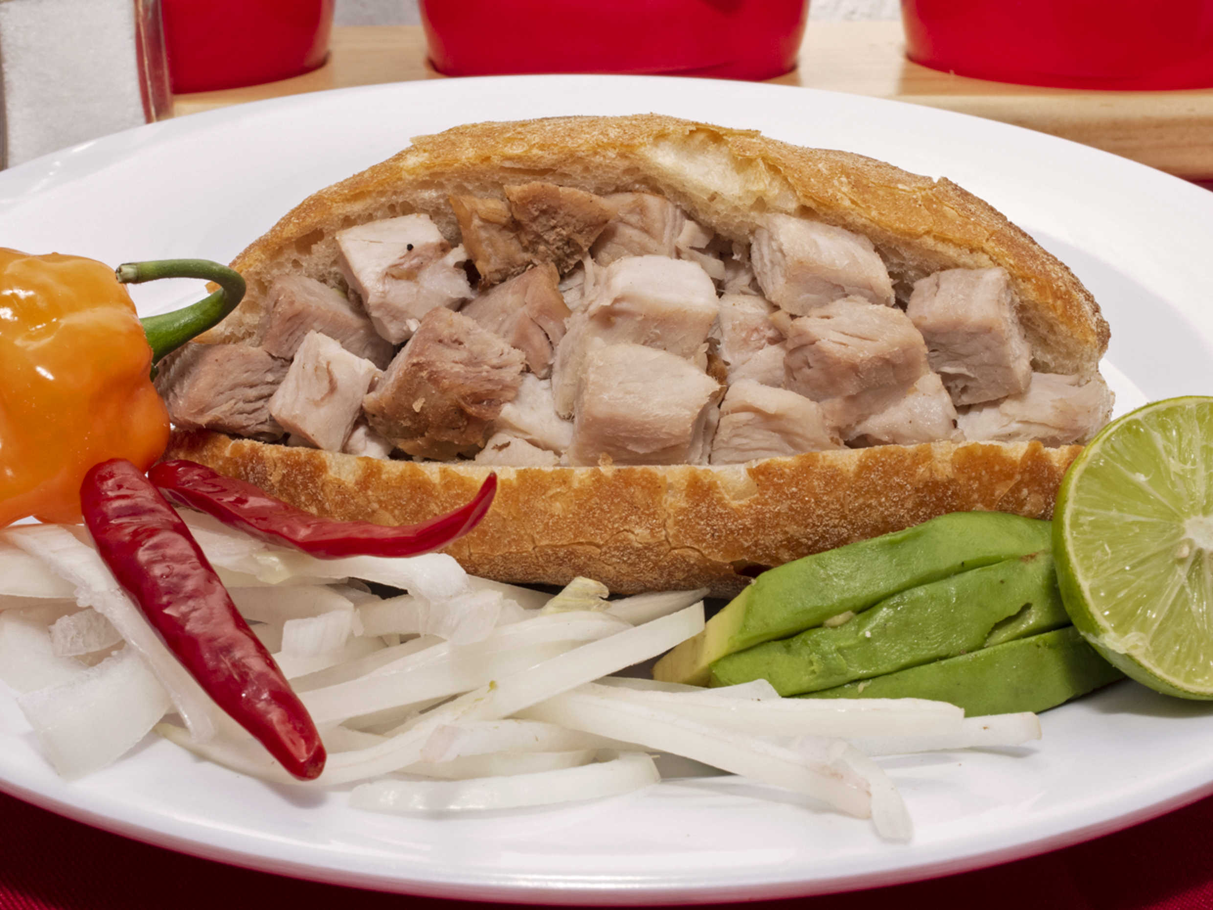 Carne de puerco en un crujiente birote salado, ahogada en nuestra traducional salsa de jitomate.