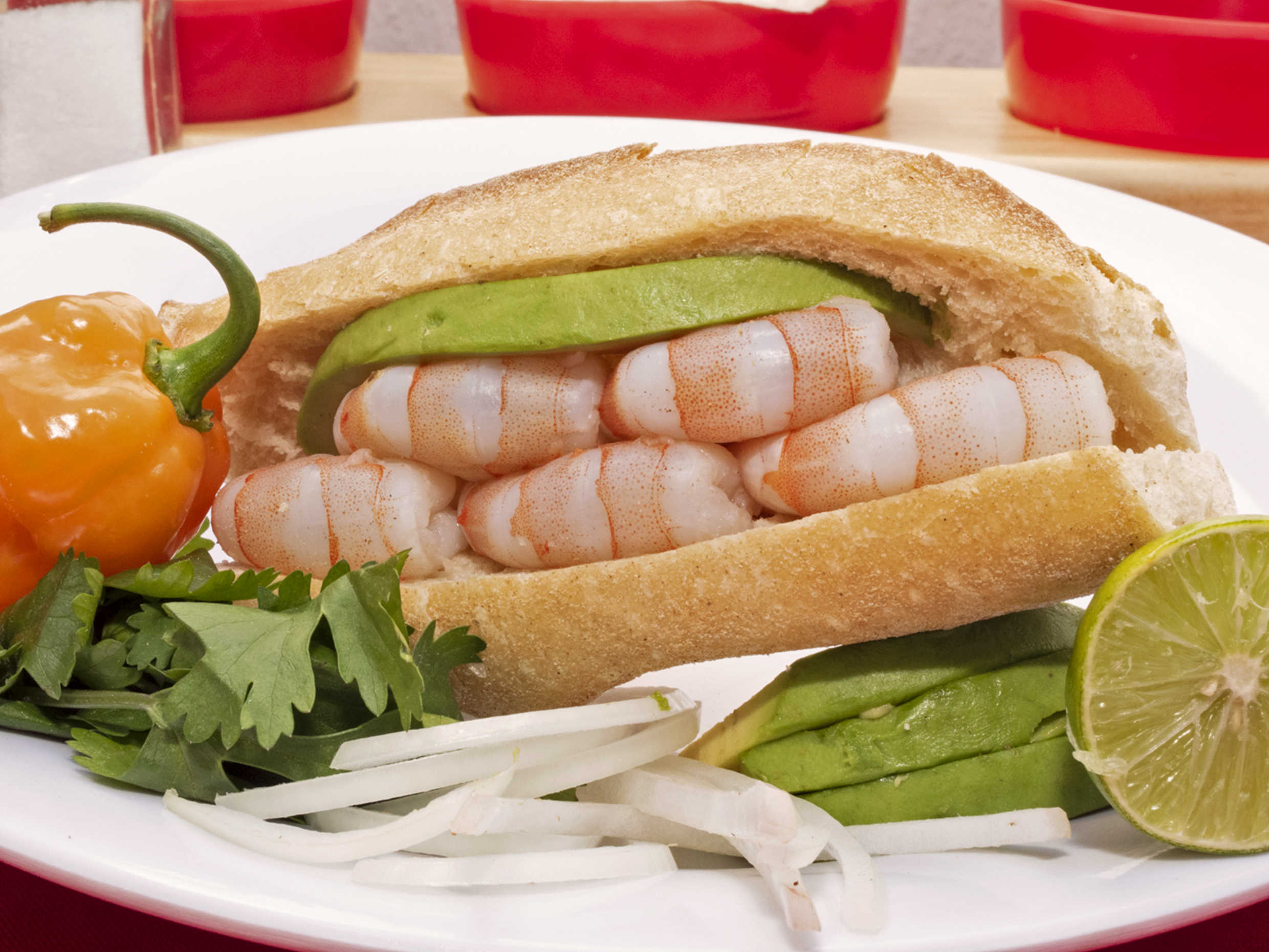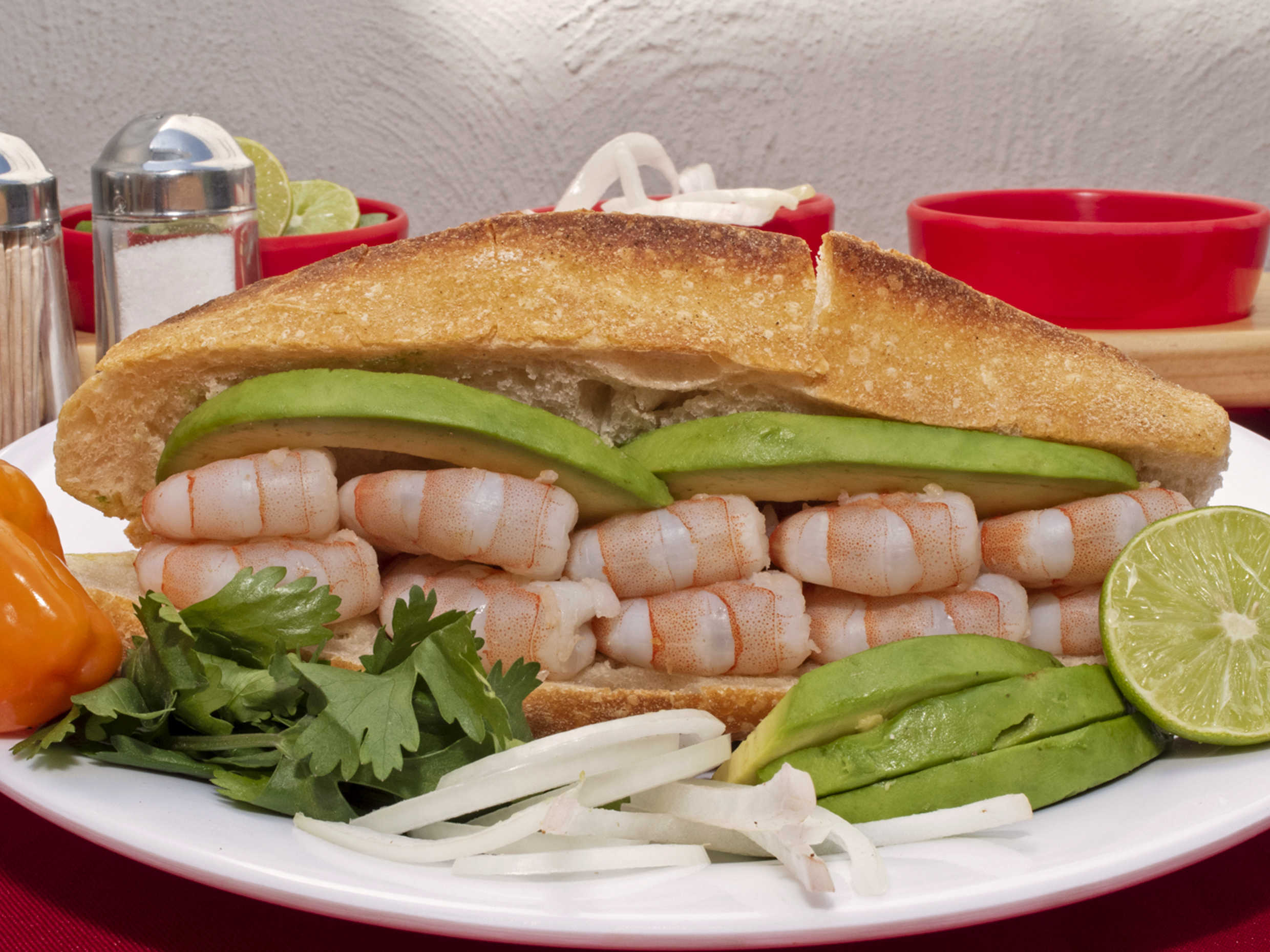 Camarón a la plancha con mantequilla en un crujiente birote salado acompañado de aguacate y ahogada en nuestro aderezo especial.