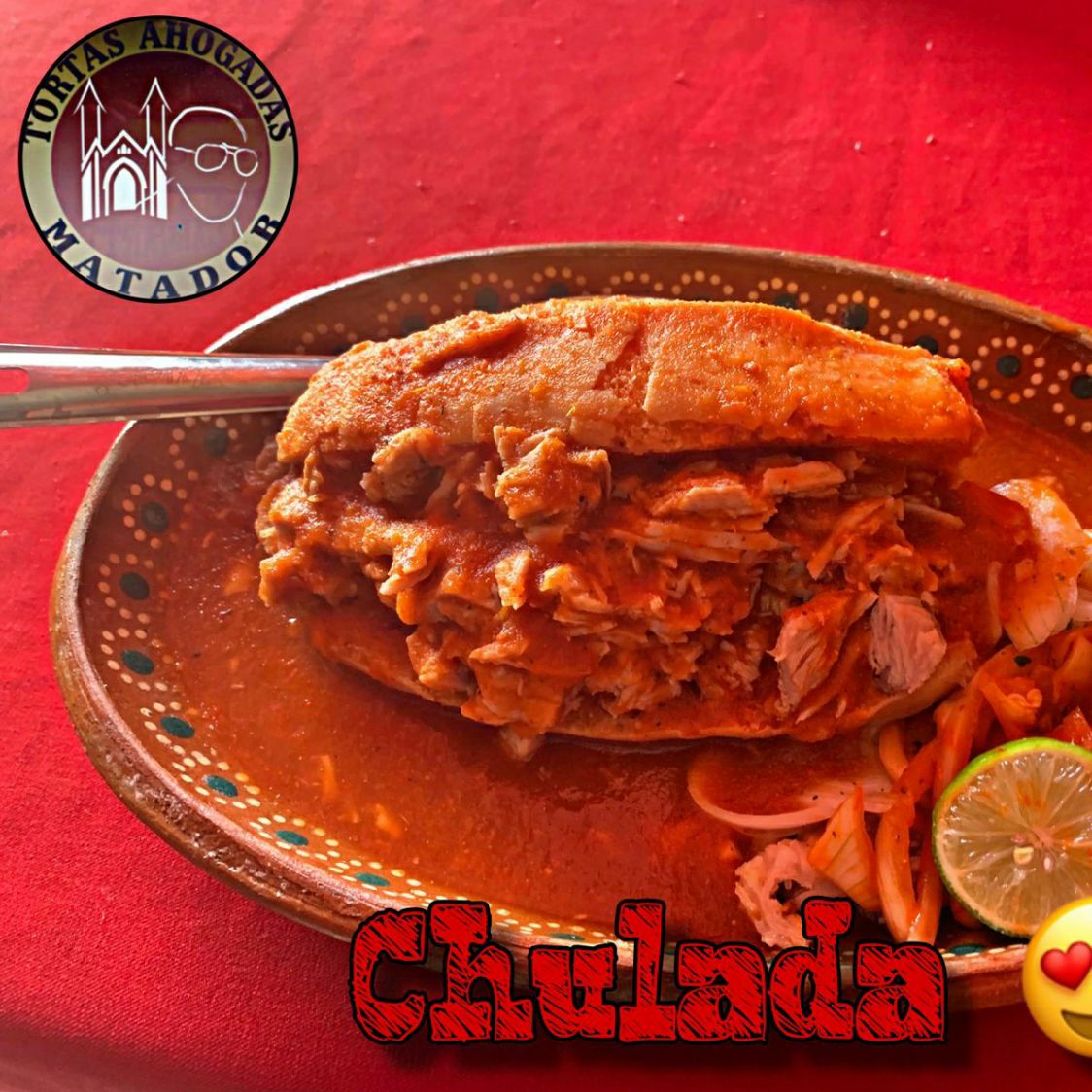 Torta de carnitas bañada con salsa de jitomate picante al gusto, acompañada de cebolla desflemada