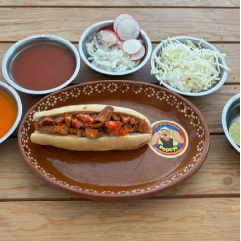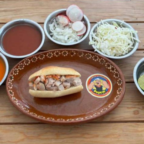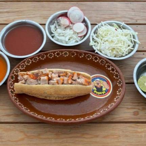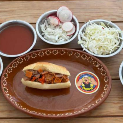 Tradicional birote salado aproximadamente 20 cm, con la típica salsa de la casa acompañado de cebolla, rábanos y la receta del chile de la casa con buche.