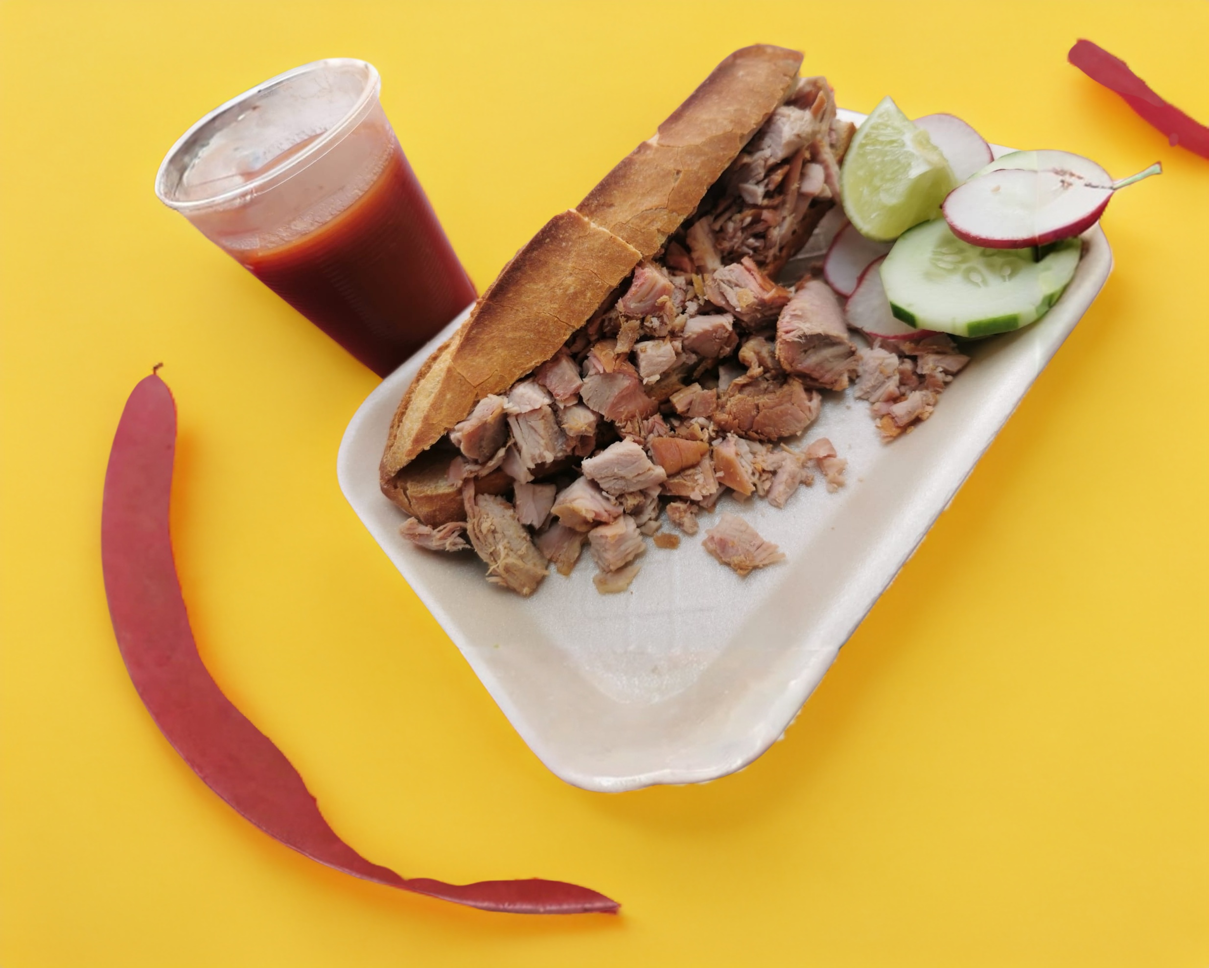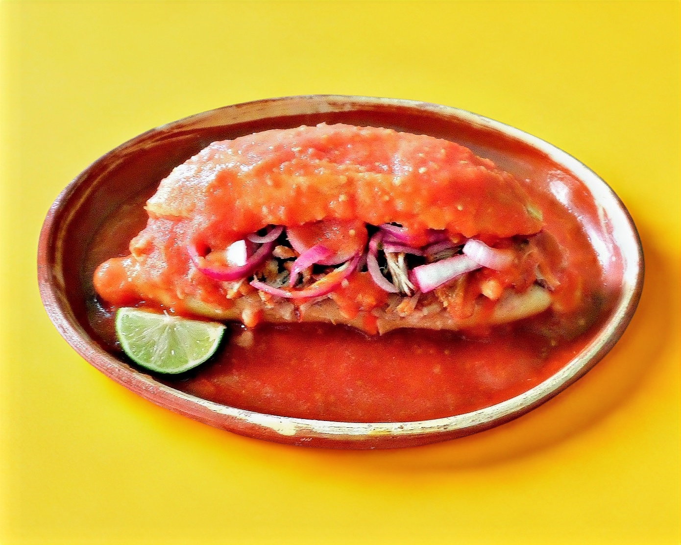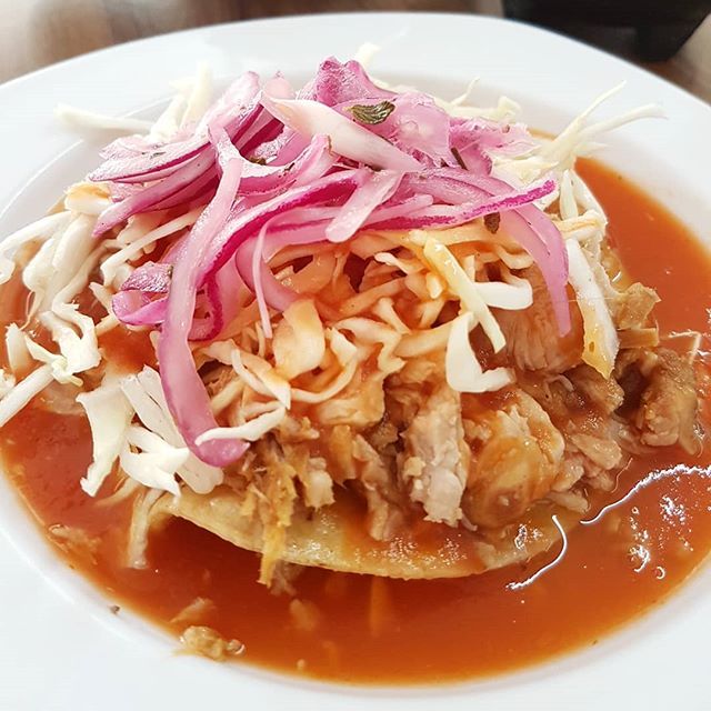 Acompañada de salsa, picante, limones, cebolla, rábanos y pepino.