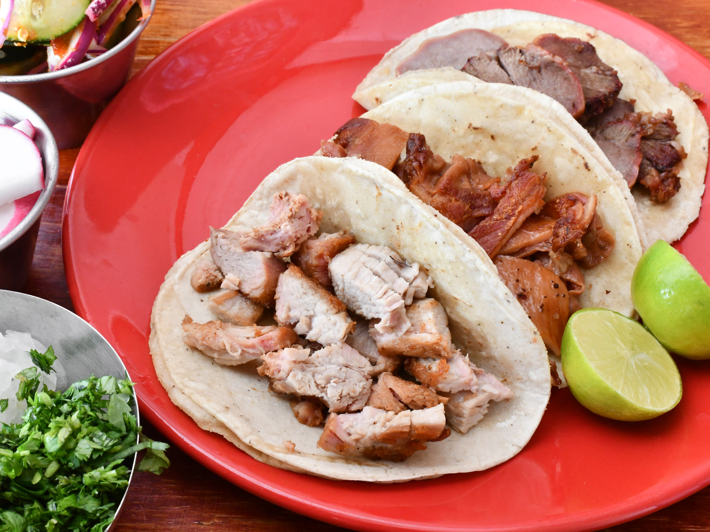 Taco dorado con una porción de carne, acompañada con col cebolla y salsas