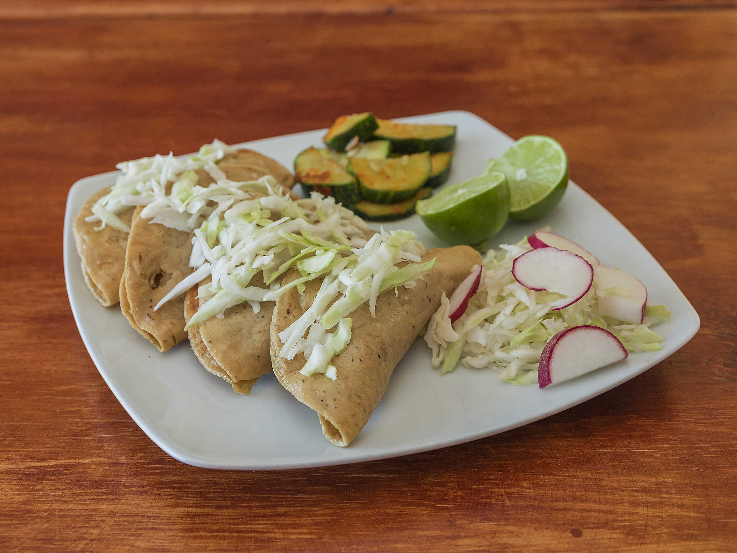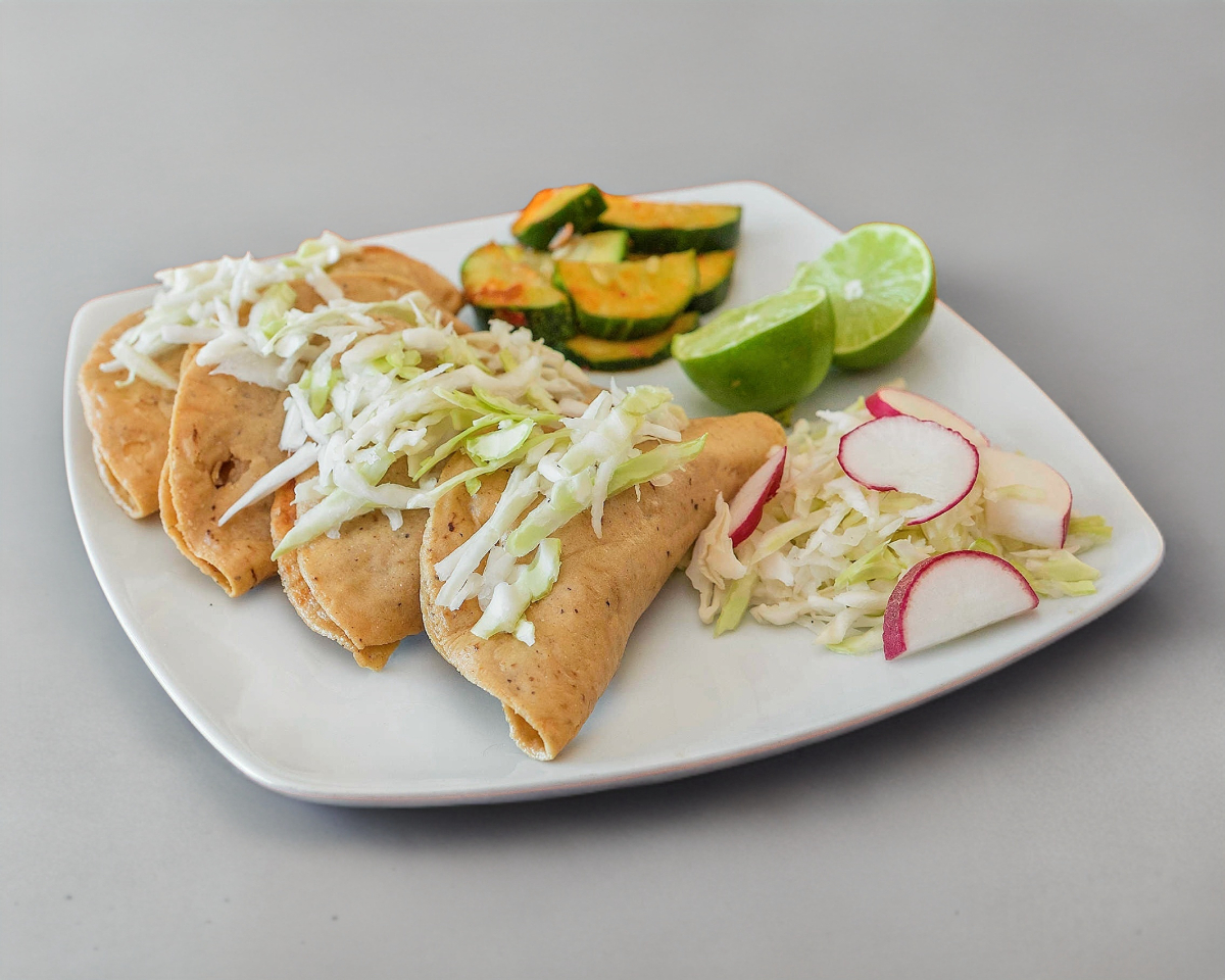 Tortilla de maíz rellena de Requesón acompañados con col cebolla y salsas