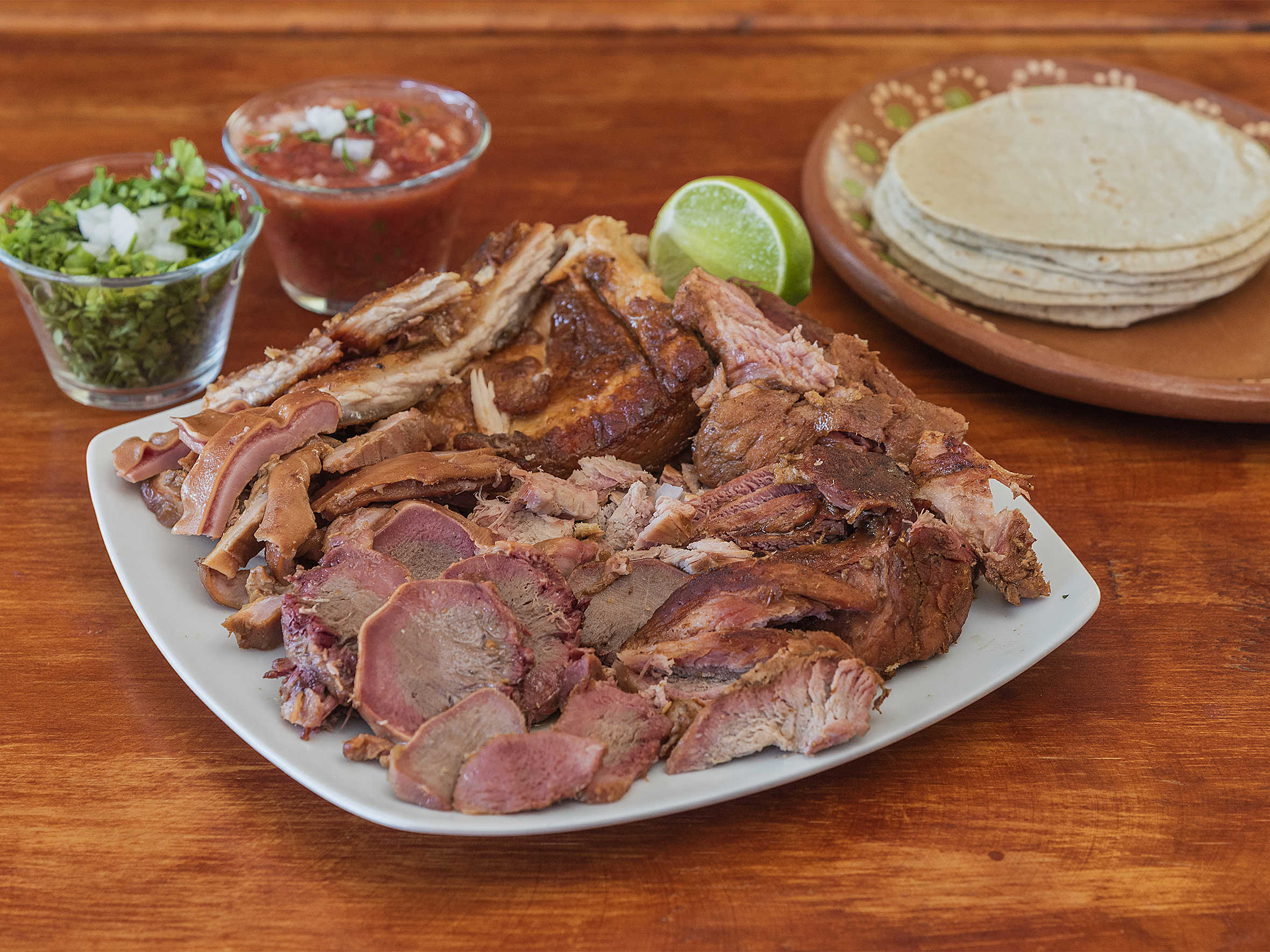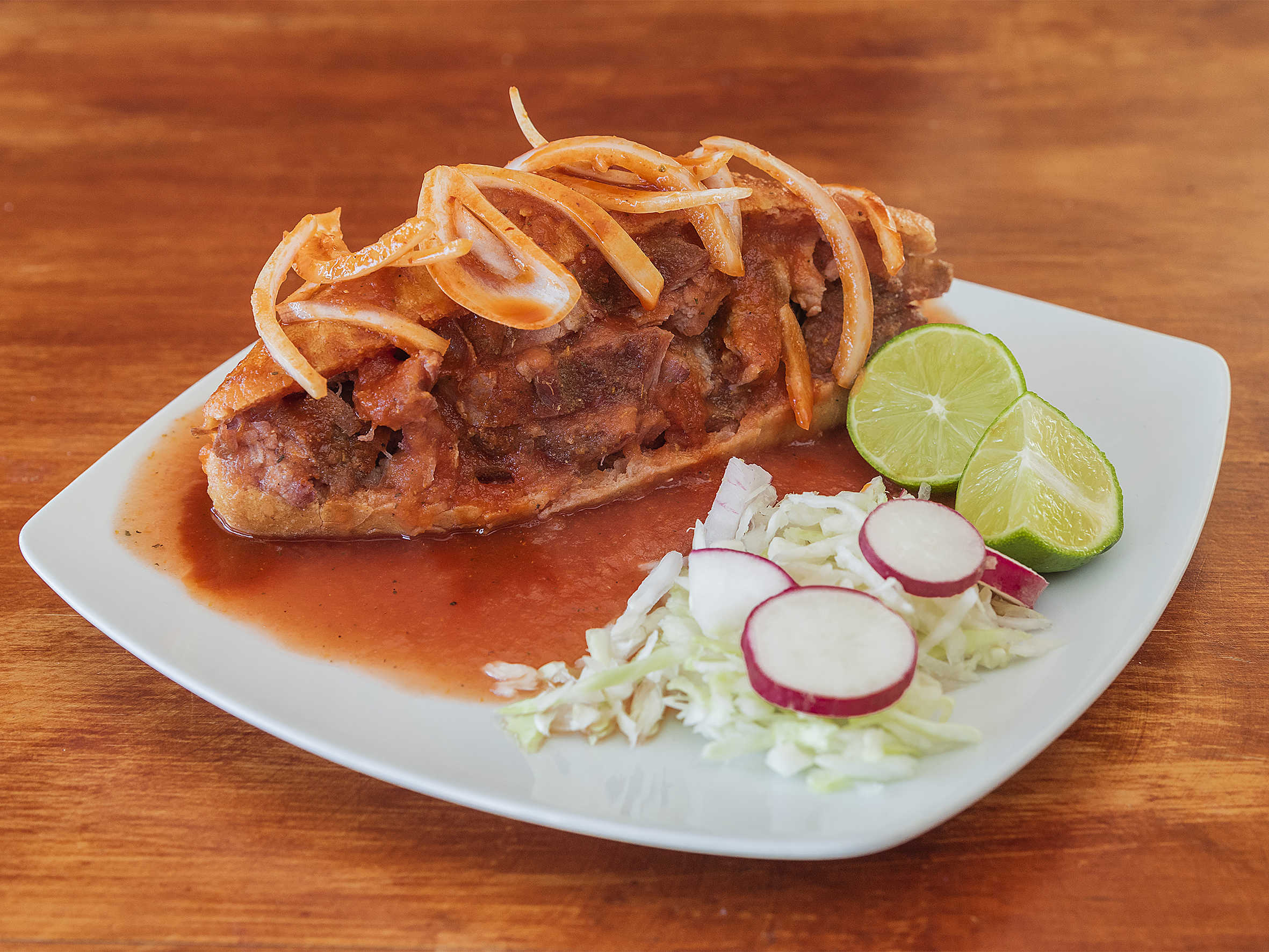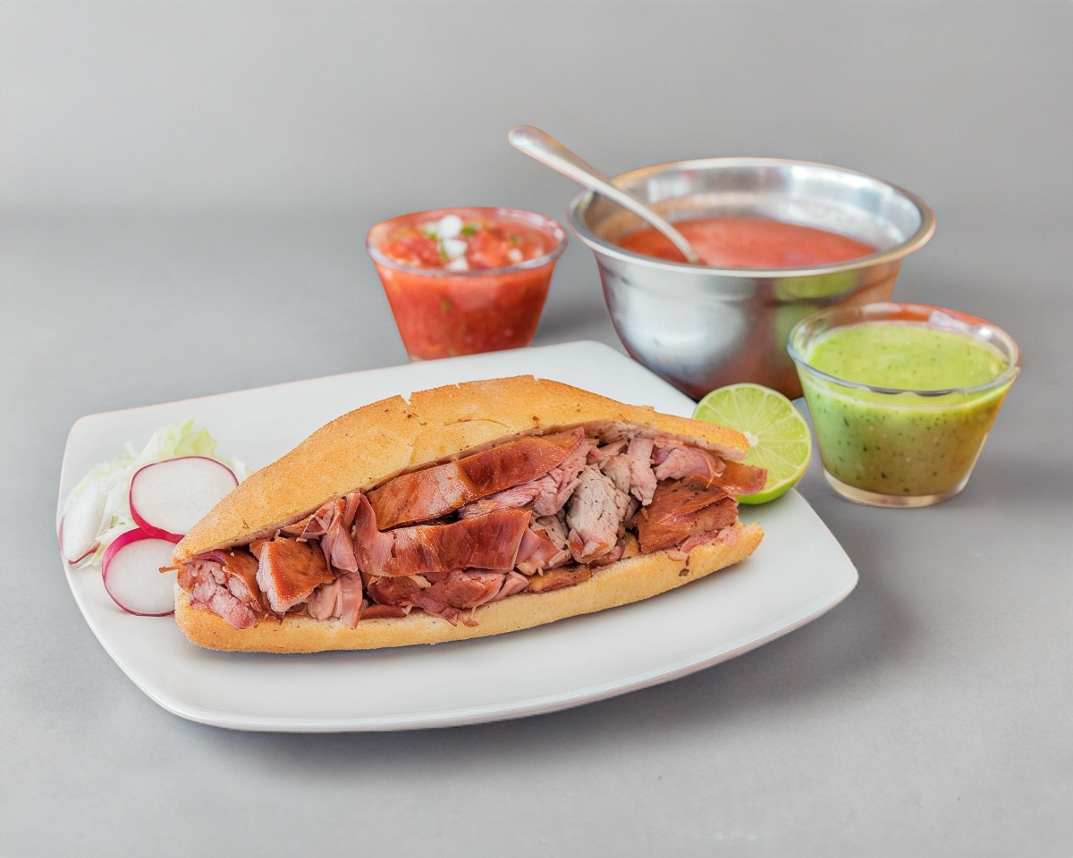 100 gramos de carne, birote salado una porción de frijoles fritos acompañada con cebolla desflemada y rica salsa de jitomate y Chile Yahualica.