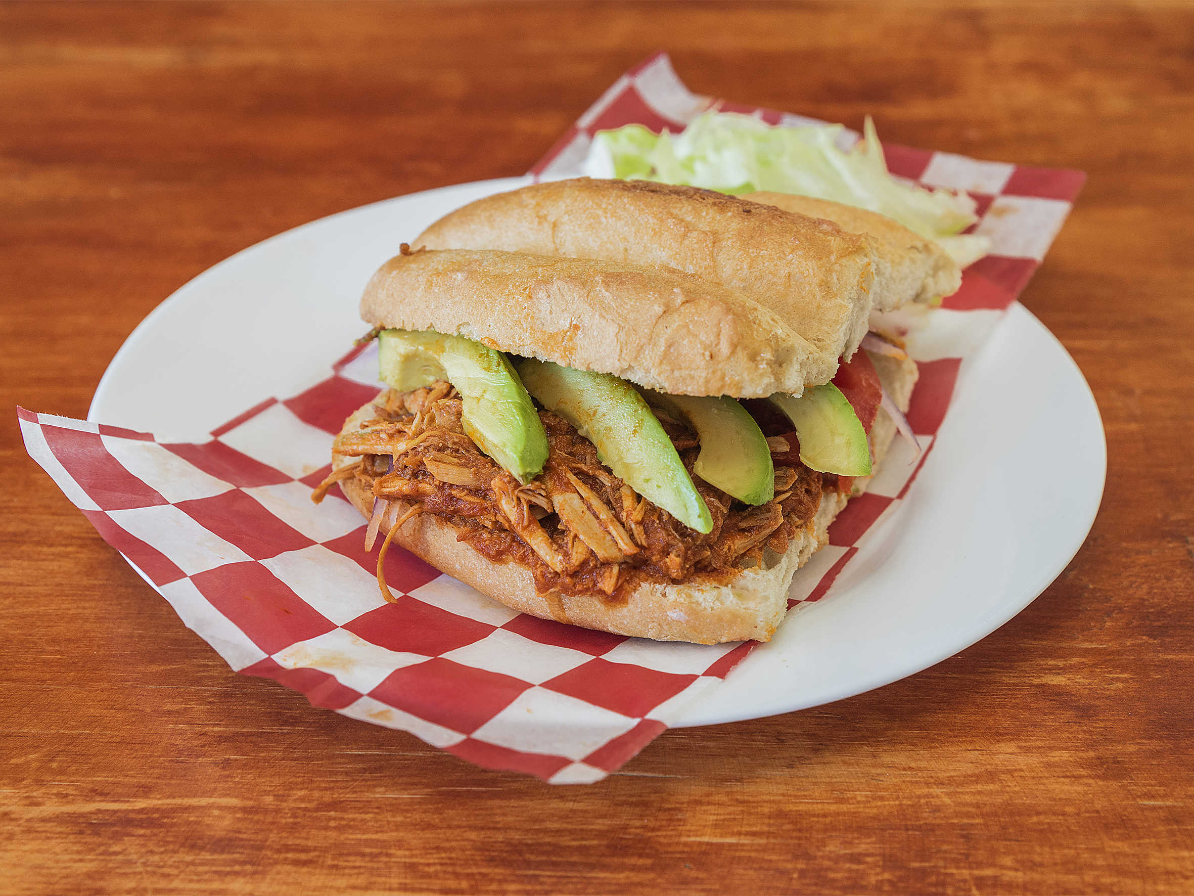 Lonche de pierna con lechuga, jitomate, cebolla, chiles jalapeños y unas rebanaditas de aguacate